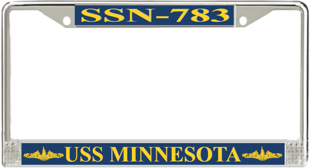 USS Minnesota SSN-783 License Plate Frame This USS Minnesota SSN-783 License Plate Frame is proudly made in the USA at our facilities in Scottsboro, Alabama. Each Frame features top and bottom sublimated design strips that are poly coated for a protective gloss finish. Please check your state and local regulations for compatibility of these frames for use on your vehicle.
