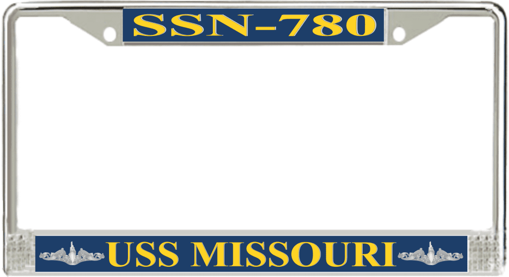 USS Missouri SSN-780 License Plate Frame This USS Missouri SSN-780 License Plate Frame is proudly made in the USA at our facilities in Scottsboro, Alabama. Each Frame features top and bottom sublimated design strips that are poly coated for a protective gloss finish. Please check your state and local regulations for compatibility of these frames for use on your vehicle.