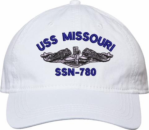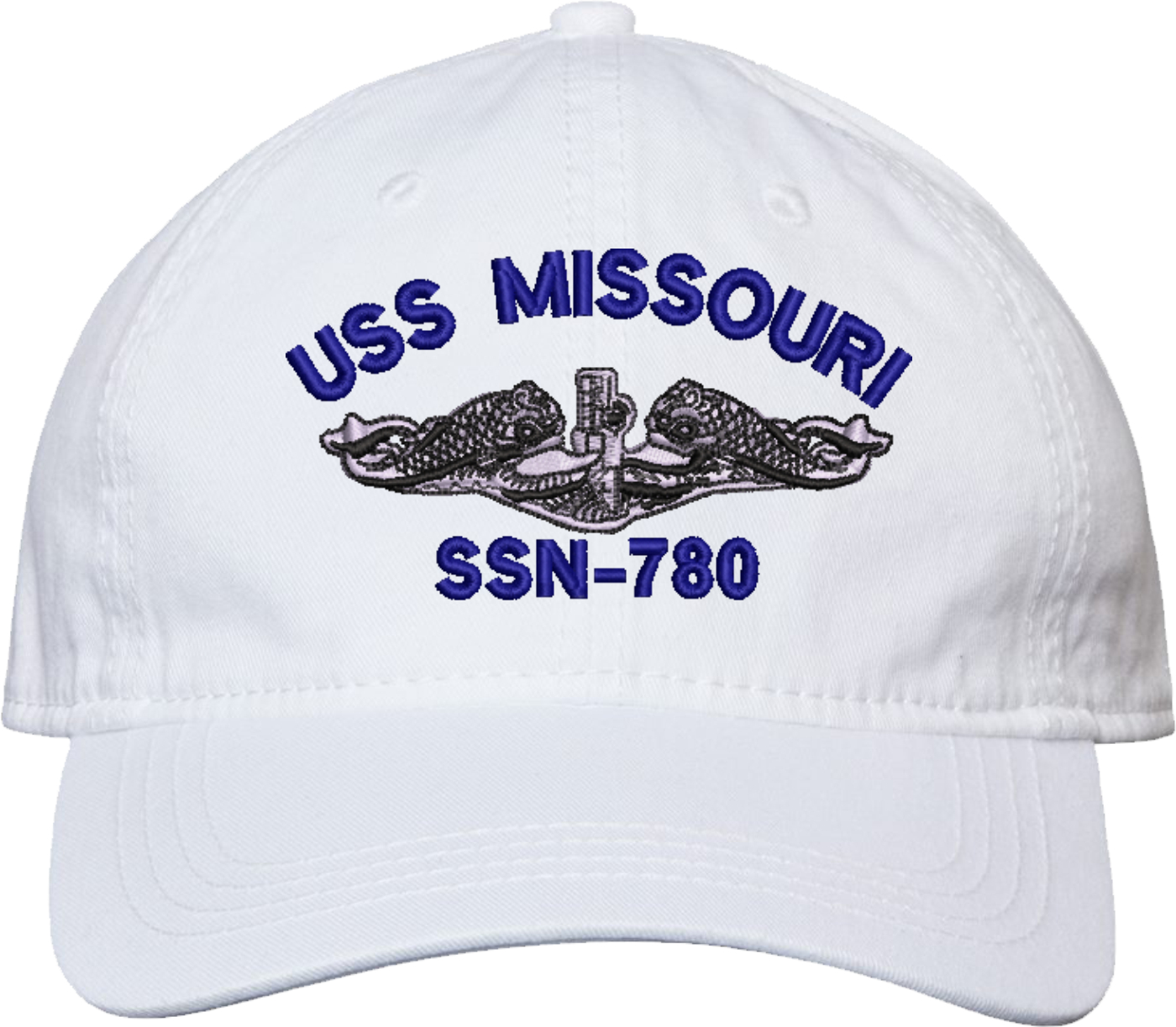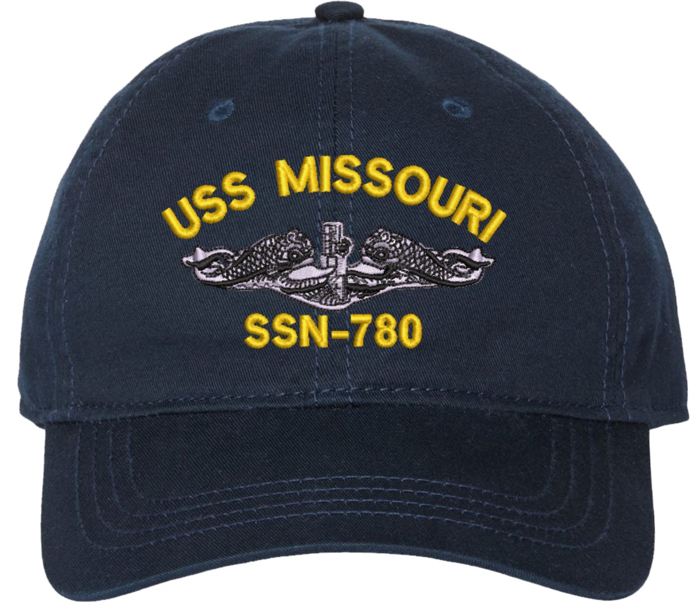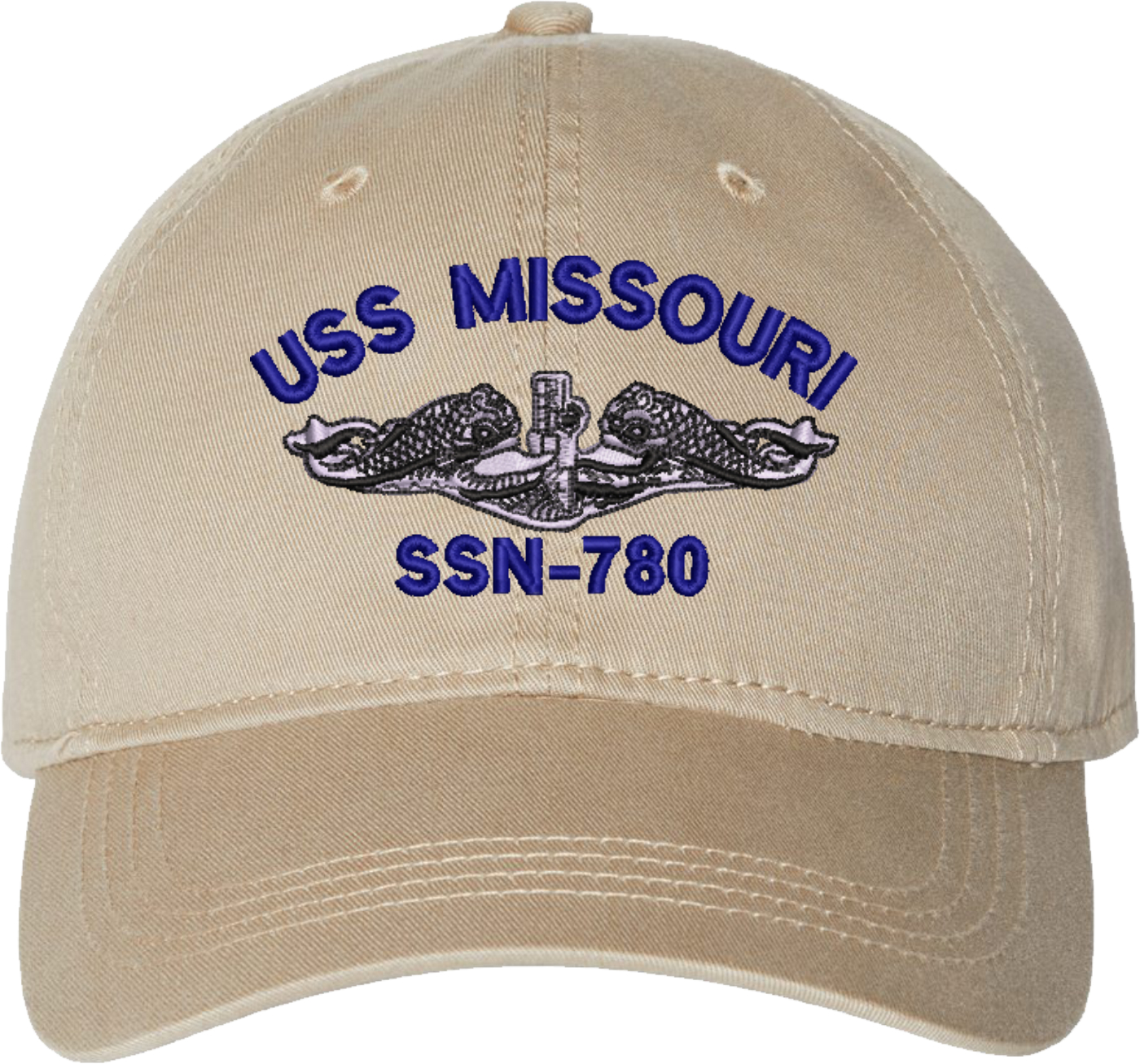 Show your Navy pride with this USS Missouri SSN-780 with Dolphins Unstructured Dad Cap from MilitaryBest. Crafted from 100% washed chino twill cotton, this six-panel, low-profile cap offers a relaxed and comfortable fit. Featuring high-quality embroidery done in our Scottsboro, Alabama facility, this cap is designed with a pre-curved visor and an adjustable tri-glide buckle closure for a perfect fit. Whether for everyday wear or as a meaningful gift, this cap is a great way to honor your own or a loved one's service.For caps ordered with custom embroidered personalized text please allow an additional 3 to 5 days production time. All custom back text will be embroidered in ALL CAPITAL LETTERS. Caps with back text or eggs are non-returnable unless there is a material defect in the cap.