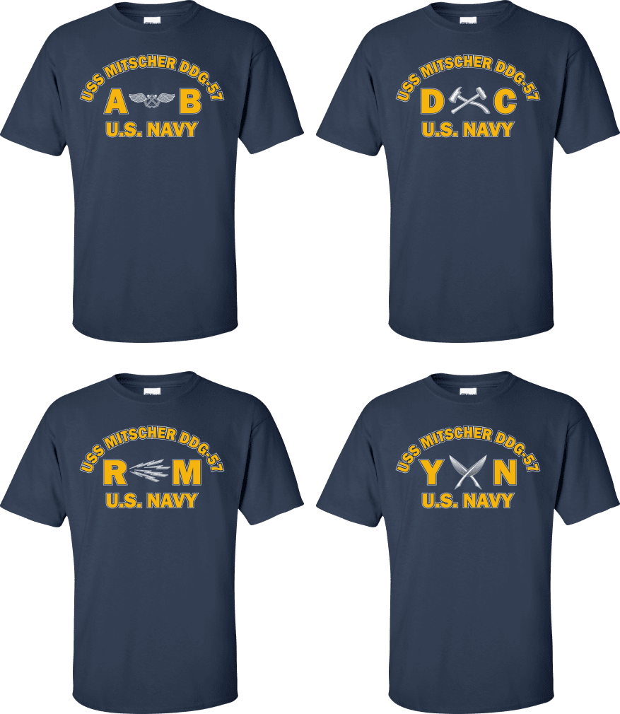 Due to disruptions in supply chains, this design will be embroidered on a Champion, Gildan, Jerzees or comparable brand.Proudly display your ship and rate with our top quality USS MITSCHER DDG-57 Rates t-shirts, sweatshirts, and hoodies. These fine U.S. Navy apparel items will make you the envy of your veteran buddies, or will make a fine gift! Our USS MITSCHER DDG-57 shirts are proudly printed in the USA!