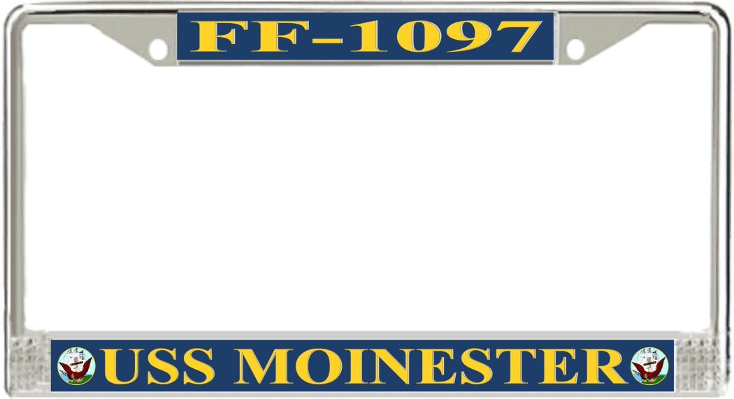 USS Moinester FF-1097 License Plate FrameThis USS Moinester FF-1097 License Plate Frame is proudly made in the USA at our facilities in Scottsboro, Alabama. Each of our MilitaryBest U.S. Navy Frames feature top and bottom Poly Coated Aluminum strips that are printed using sublimation which gives these quality automobile military frames a beautiful high gloss finish.