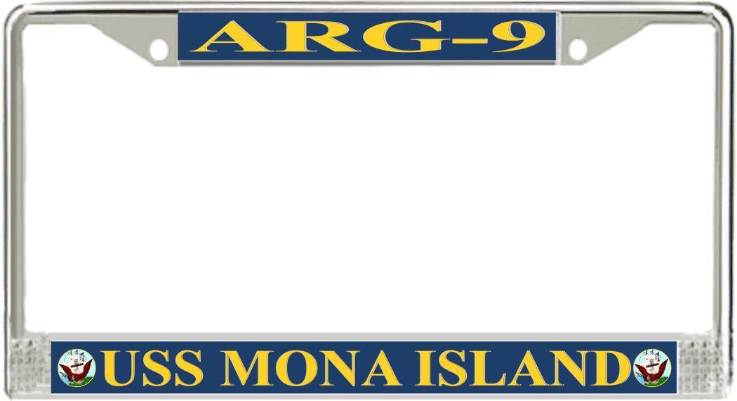 USS Mona Island ARG-9 License Plate FrameThis USS Mona Island ARG-9 License Plate Frame is proudly made in the USA at our facilities in Scottsboro, Alabama. Each of our MilitaryBest U.S. Navy Frames feature top and bottom Poly Coated Aluminum strips that are printed using sublimation which gives these quality automobile military frames a beautiful high gloss finish.