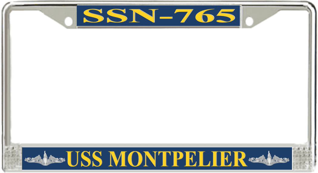 USS Montpelier SSN-765 License Plate Frame This USS Montpelier SSN-765 License Plate Frame is proudly made in the USA at our facilities in Scottsboro, Alabama. Each Frame features top and bottom sublimated design strips that are poly coated for a protective gloss finish. Please check your state and local regulations for compatibility of these frames for use on your vehicle.