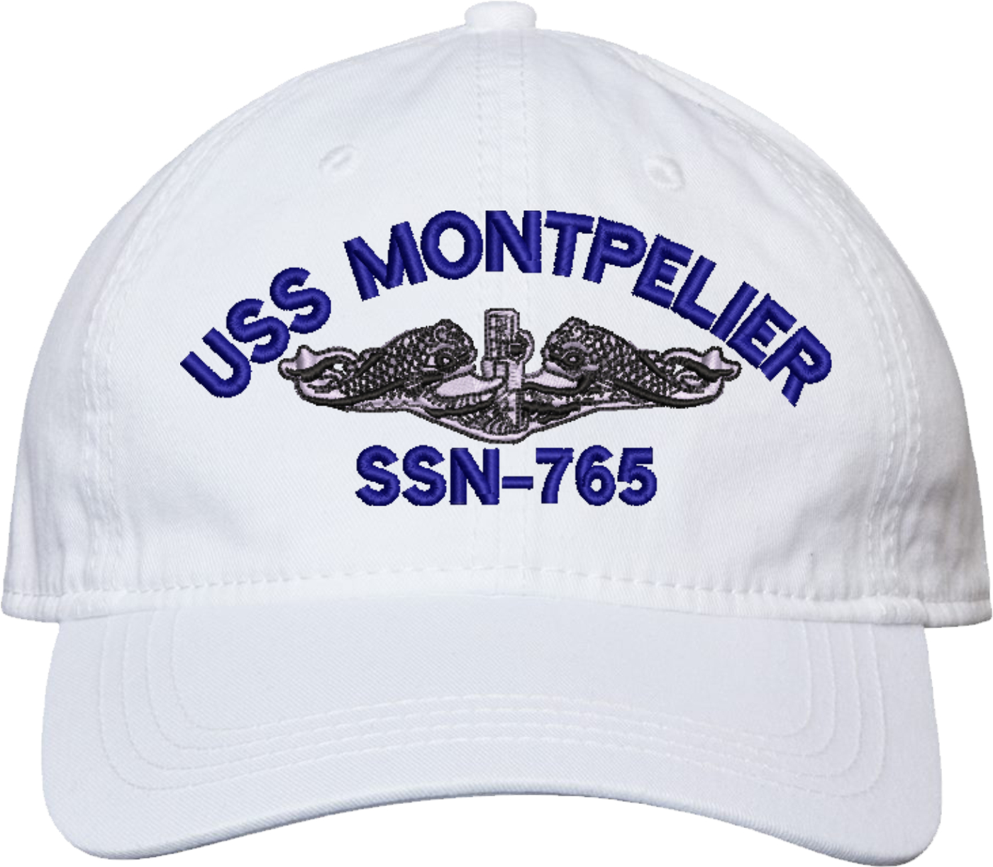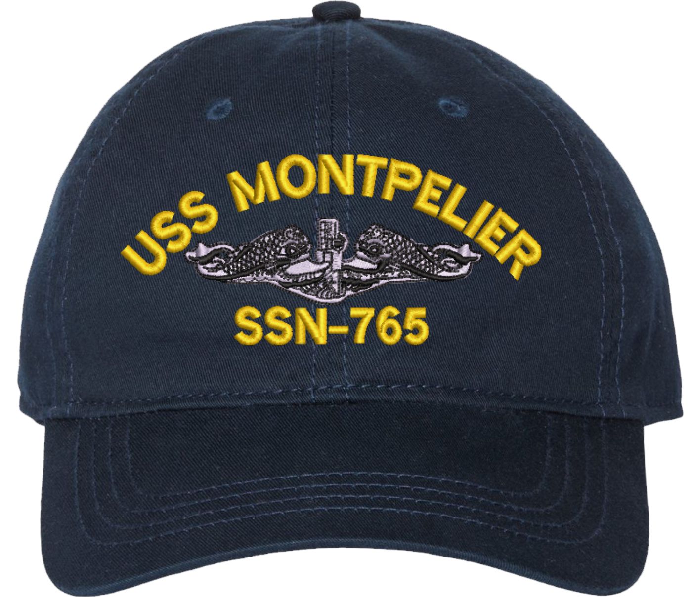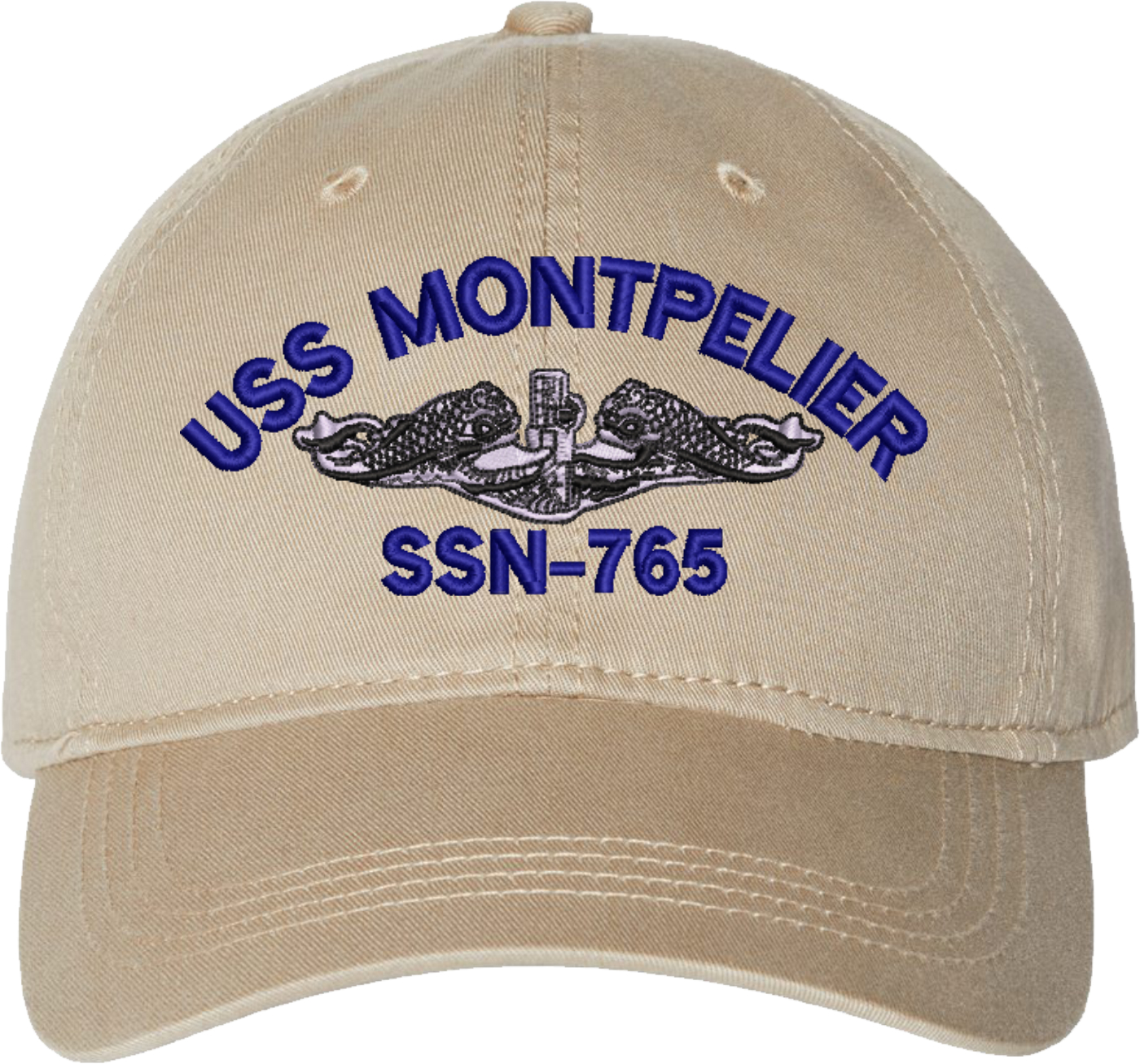 Show your Navy pride with this USS Montpelier SSN-765 with Dolphins Unstructured Dad Cap from MilitaryBest. Crafted from 100% washed chino twill cotton, this six-panel, low-profile cap offers a relaxed and comfortable fit. Featuring high-quality embroidery done in our Scottsboro, Alabama facility, this cap is designed with a pre-curved visor and an adjustable tri-glide buckle closure for a perfect fit. Whether for everyday wear or as a meaningful gift, this cap is a great way to honor your own or a loved one's service.For caps ordered with custom embroidered personalized text please allow an additional 3 to 5 days production time. All custom back text will be embroidered in ALL CAPITAL LETTERS. Caps with back text or eggs are non-returnable unless there is a material defect in the cap.