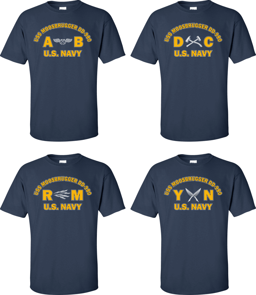 Due to disruptions in supply chains, this design will be embroidered on a Champion, Gildan, Jerzees or comparable brand.Proudly display your ship and rate with our top quality USS MOOSBRUGGER DD-980 Rates t-shirts, sweatshirts, and hoodies. These fine U.S. Navy apparel items will make you the envy of your veteran buddies, or will make a fine gift! Our USS MOOSBRUGGER DD-980 shirts are proudly printed in the USA!