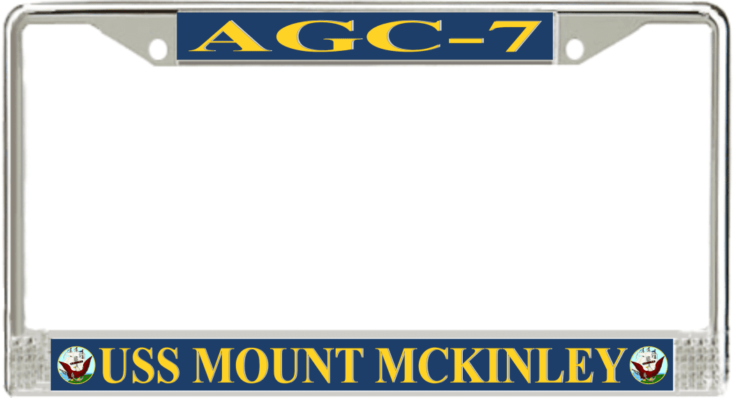 USS Mount McKinley AGC-7 License Plate FrameThis USS Mount McKinley AGC-7 License Plate Frame is proudly made in the USA at our facilities in Scottsboro, Alabama. Each of our MilitaryBest U.S. Navy Frames feature top and bottom Poly Coated Aluminum strips that are printed using sublimation which gives these quality automobile military frames a beautiful high gloss finish.