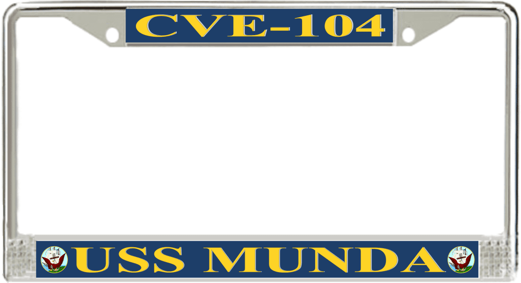 USS Munda CVE-104 License Plate Frame This USS Munda CVE-104 License Plate Frame is proudly made in the USA at our facilities in Scottsboro, Alabama. Each Frame features top and bottom sublimated design strips that are poly coated for a protective gloss finish.