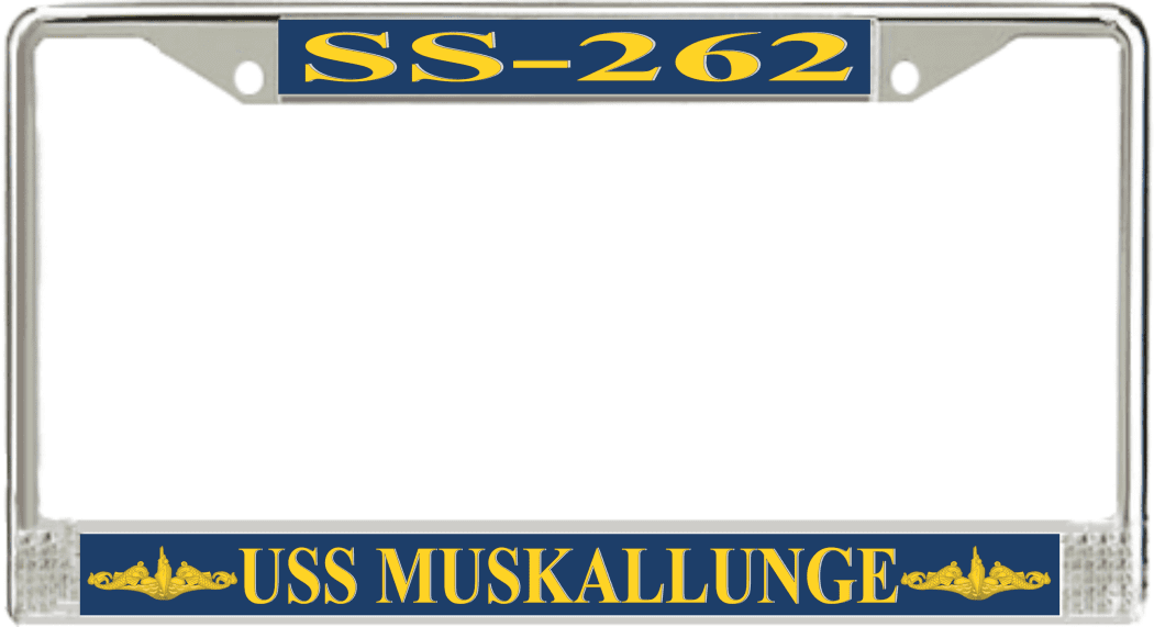 USS Muskallunge SS-262 License Plate Frame This USS Muskallunge SS-262 License Plate Frame is proudly made in the USA at our facilities in Scottsboro, Alabama. Each Frame features top and bottom sublimated design strips that are poly coated for a protective gloss finish. Please check your state and local regulations for compatibility of these frames for use on your vehicle.