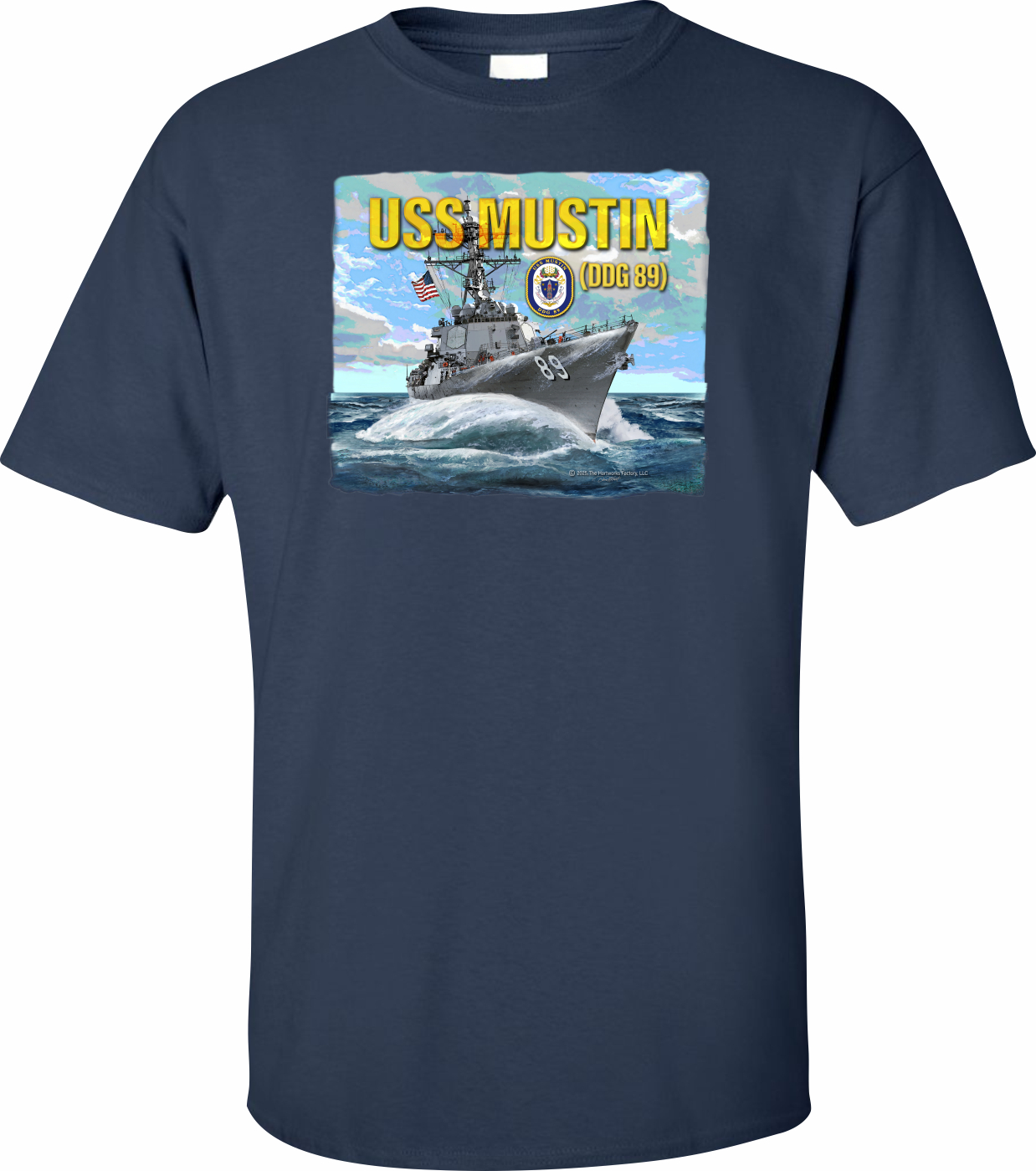 MilitaryBest is proud to offer this fine USS Mustin DDG-89 Printed Art T-Shirt. This shirt features a full front print, with beautiful artwork designed by licensed Navy artist David Hart. This shirt is available in black and navy blue colors. Each T-shirt is proudly printed in the USA.Unless there is a defect in workmanship or material, these shirts are unreturnable.