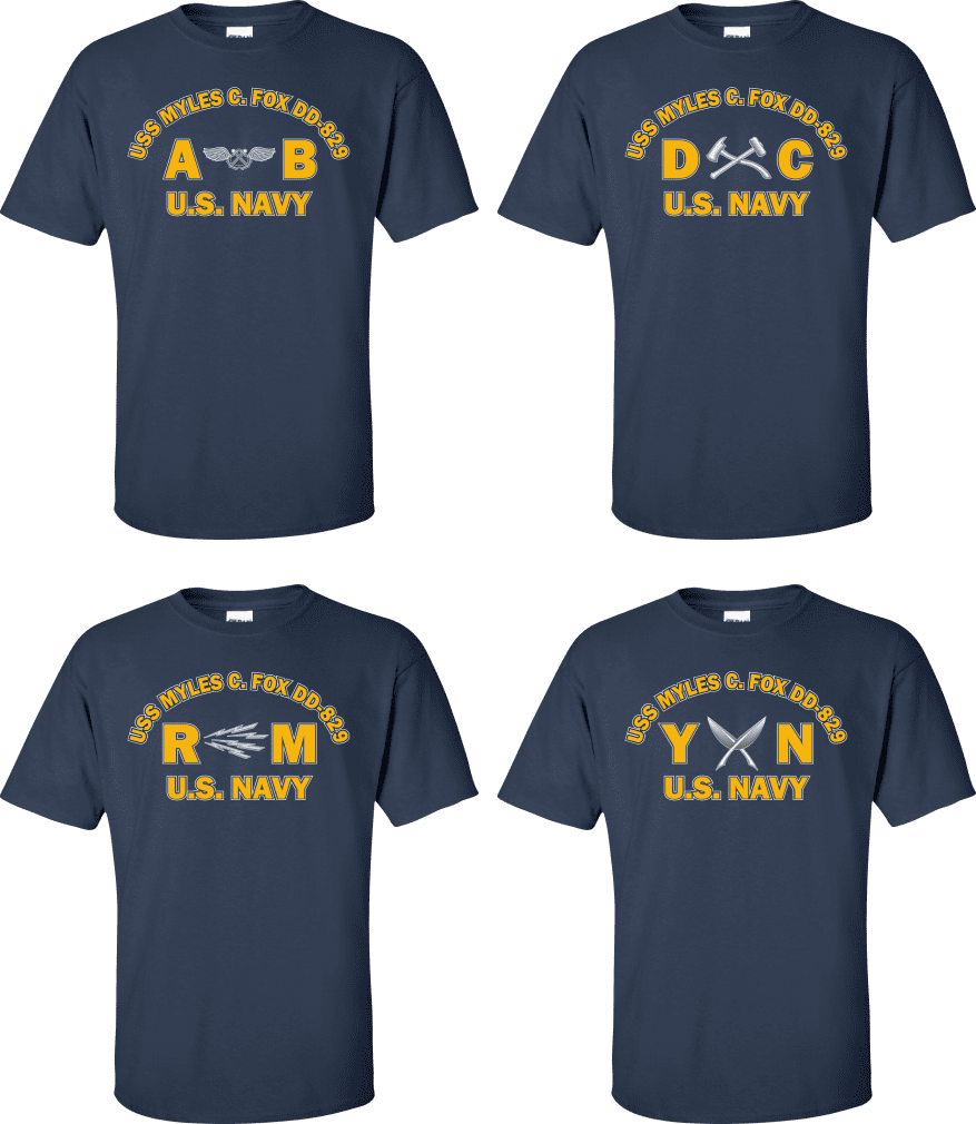 Due to disruptions in supply chains, this design will be embroidered on a Champion, Gildan, Jerzees or comparable brand.Proudly display your ship and rate with our top quality USS MYLES C. FOX DD-829 Rates t-shirts, sweatshirts, and hoodies. These fine U.S. Navy apparel items will make you the envy of your veteran buddies, or will make a fine gift! Our USS MYLES C. FOX DD-829 shirts are proudly printed in the USA!