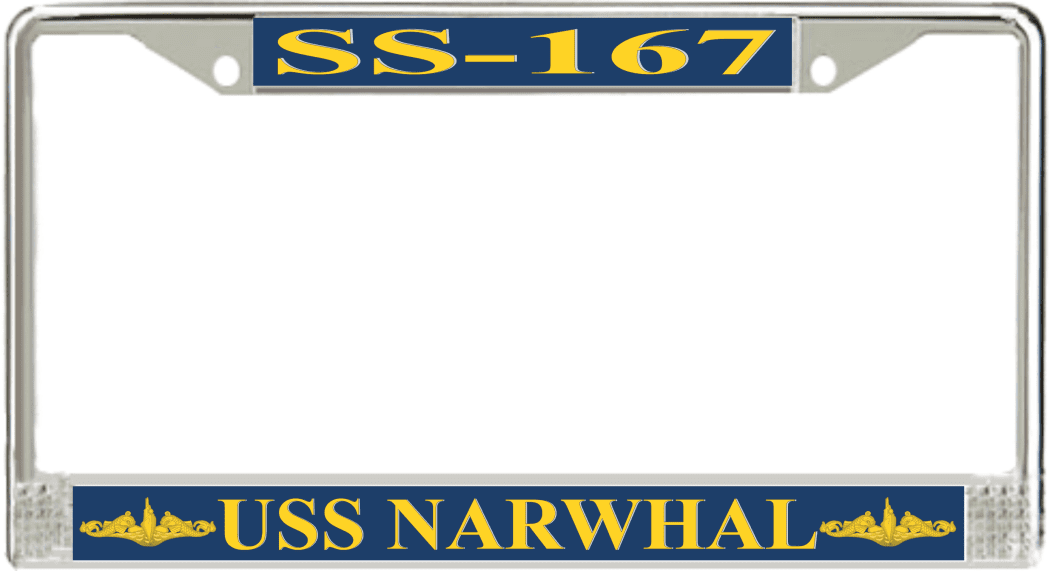 USS Narwhal SS-167 License Plate Frame This USS Narwhal SS-167 License Plate Frame is proudly made in the USA at our facilities in Scottsboro, Alabama. Each Frame features top and bottom sublimated design strips that are poly coated for a protective gloss finish. Please check your state and local regulations for compatibility of these frames for use on your vehicle.