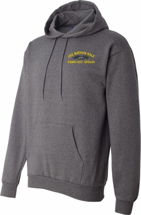 MilitaryBest has expanded its line of apparel with this custom embroidered USS Nathan Hale SSBN-623 (GOLD) with Dolphins Embroidered Hoodie. Each Hoodie is direct embroidered onto a Champion brand 9.5 oz 50/50 Cotton Poly blend. This Hoodie will make an excellent addition to your wardrobe, or a great gift. Your satisfaction is Guaranteed! These quality hoodies are proudly embroidered at our facilities in Scottsboro, AL. Support the Army MWR program by purchasing only from Licensed Vendors.
