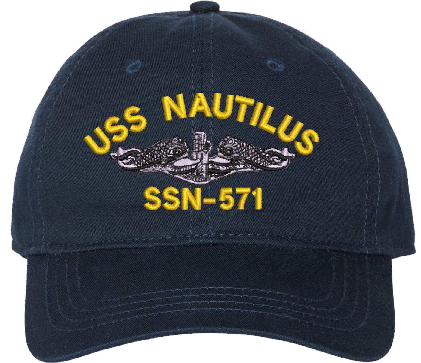 Show your Navy pride with this USS Nautilus SSN-571 with Dolphins Unstructured Dad Cap from MilitaryBest. Crafted from 100% washed chino twill cotton, this six-panel, low-profile cap offers a relaxed and comfortable fit. Featuring high-quality embroidery done in our Scottsboro, Alabama facility, this cap is designed with a pre-curved visor and an adjustable tri-glide buckle closure for a perfect fit. Whether for everyday wear or as a meaningful gift, this cap is a great way to honor your own or a loved one's service.For caps ordered with custom embroidered personalized text please allow an additional 3 to 5 days production time. All custom back text will be embroidered in ALL CAPITAL LETTERS. Caps with back text or eggs are non-returnable unless there is a material defect in the cap.