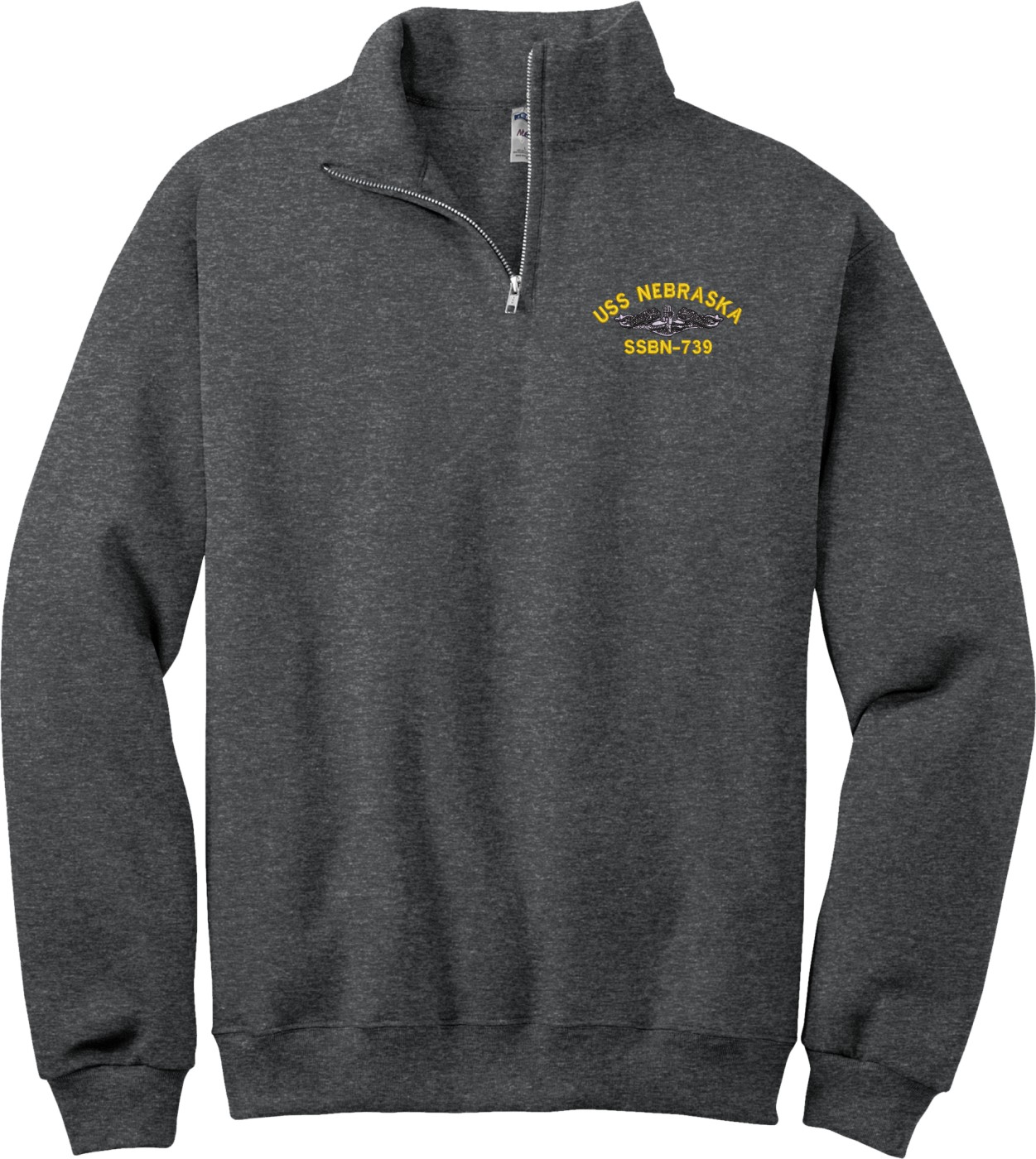 MilitaryBest is proud to offer this USS Nebraska SSBN-739 with Dolphins Embroidered Quarter-Zip Pullover. This quality shirt is embroidered by our MilitaryBest team in Northeast Alabama.PRODUCT FEATURES