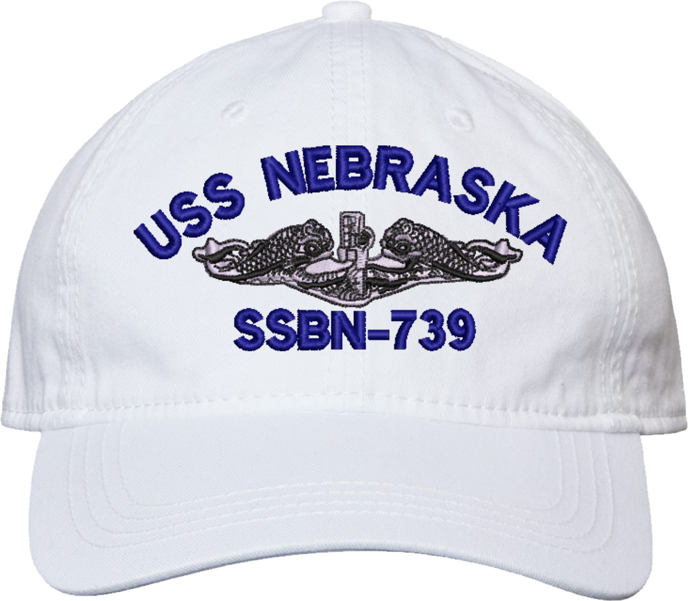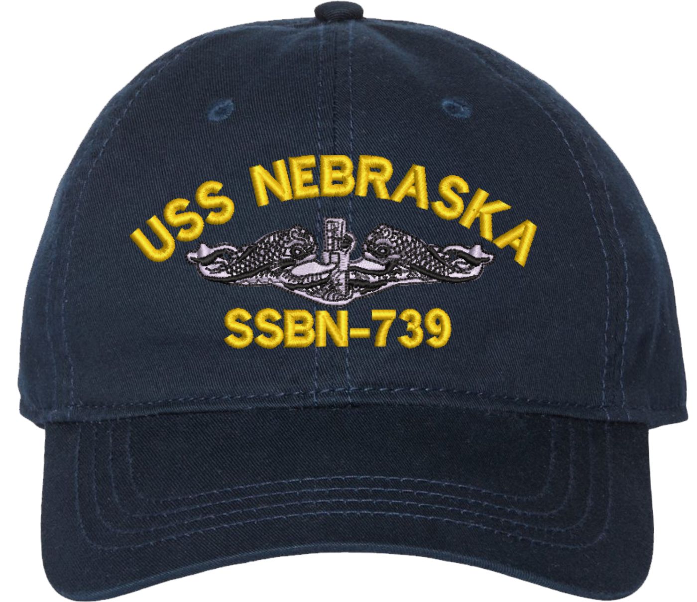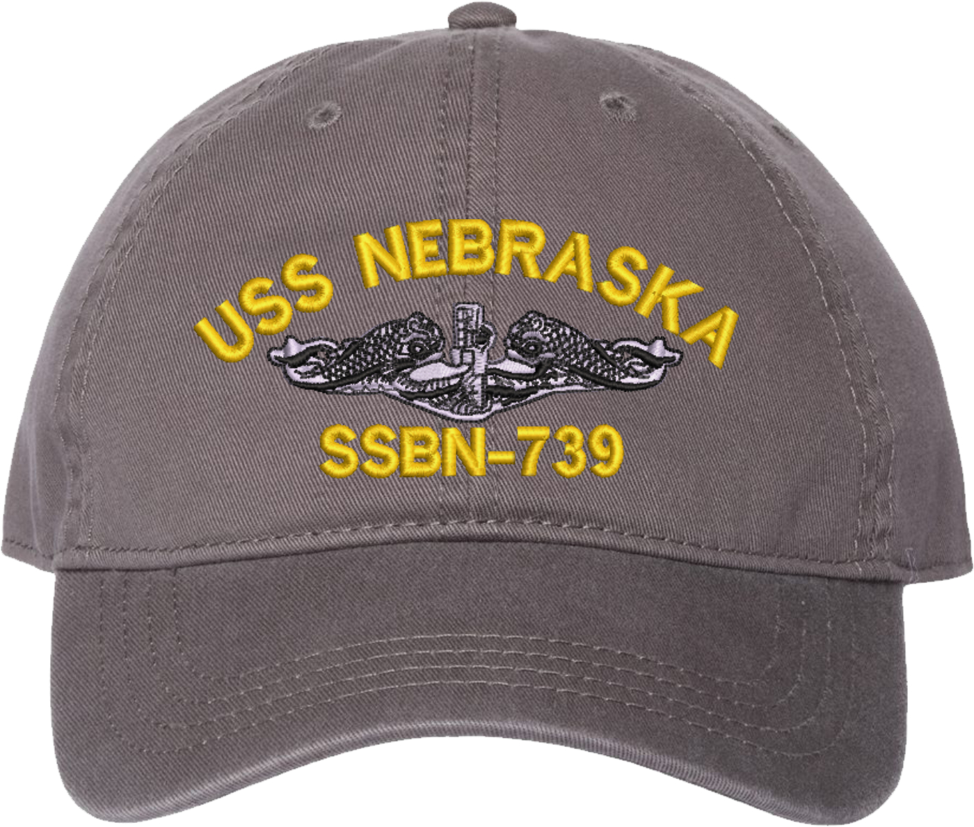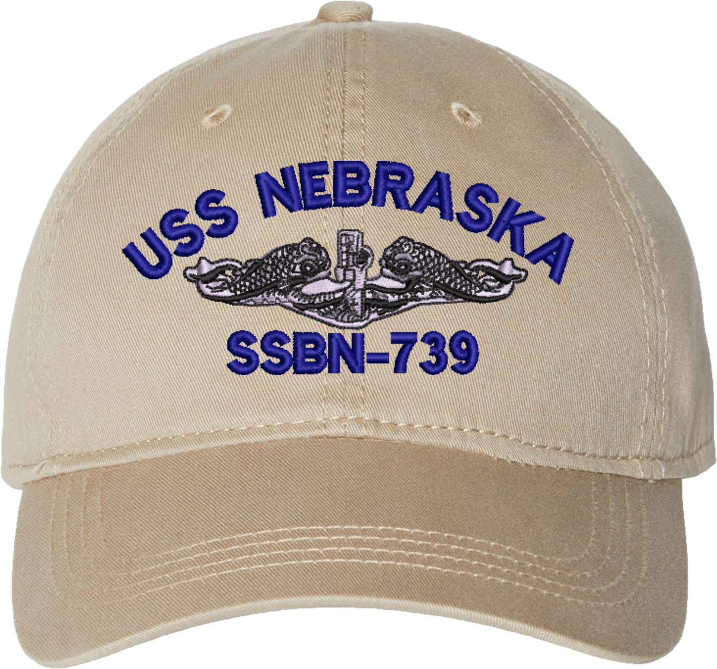 Show your Navy pride with this USS Nebraska SSBN-739 with Dolphins Unstructured Dad Cap from MilitaryBest. Crafted from 100% washed chino twill cotton, this six-panel, low-profile cap offers a relaxed and comfortable fit. Featuring high-quality embroidery done in our Scottsboro, Alabama facility, this cap is designed with a pre-curved visor and an adjustable tri-glide buckle closure for a perfect fit. Whether for everyday wear or as a meaningful gift, this cap is a great way to honor your own or a loved one's service.For caps ordered with custom embroidered personalized text please allow an additional 3 to 5 days production time. All custom back text will be embroidered in ALL CAPITAL LETTERS. Caps with back text or eggs are non-returnable unless there is a material defect in the cap.
