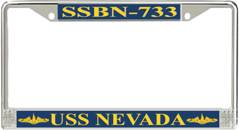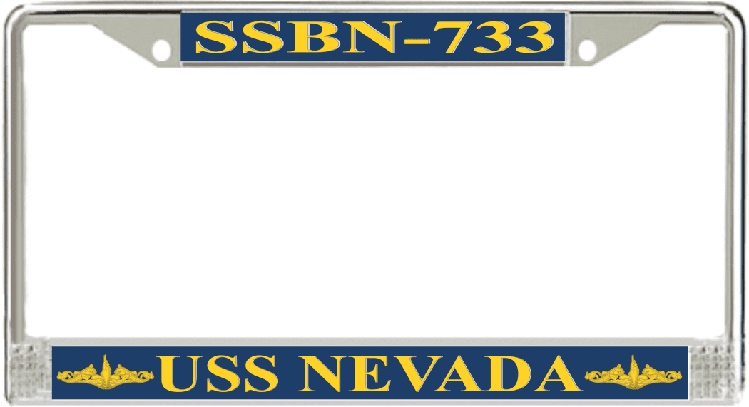 USS Nevada  SSBN-733 License Plate Frame This USS Nevada SSBN-733 License Plate Frame is proudly made in the USA at our facilities in Scottsboro, Alabama. Each Frame features top and bottom sublimated design strips that are poly coated for a protective gloss finish. Please check your state and local regulations for compatibility of these frames for use on your vehicle.