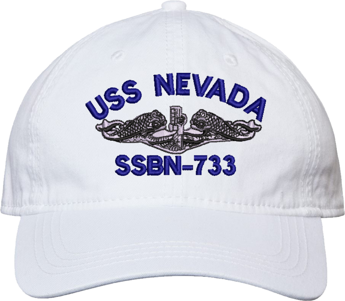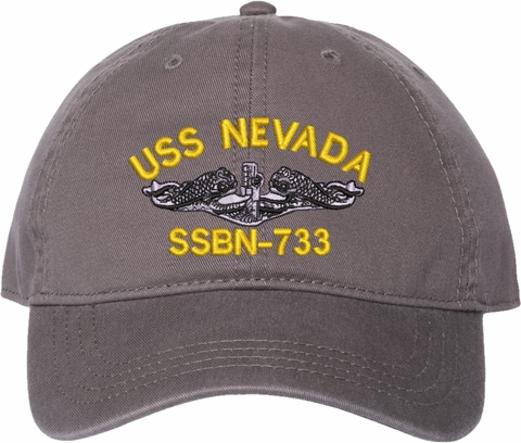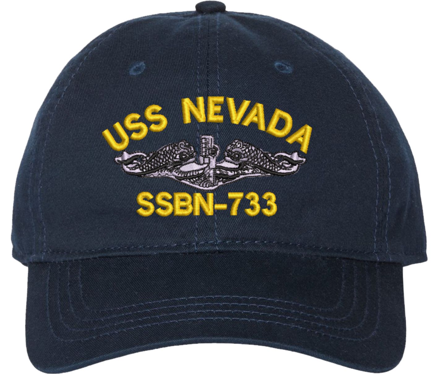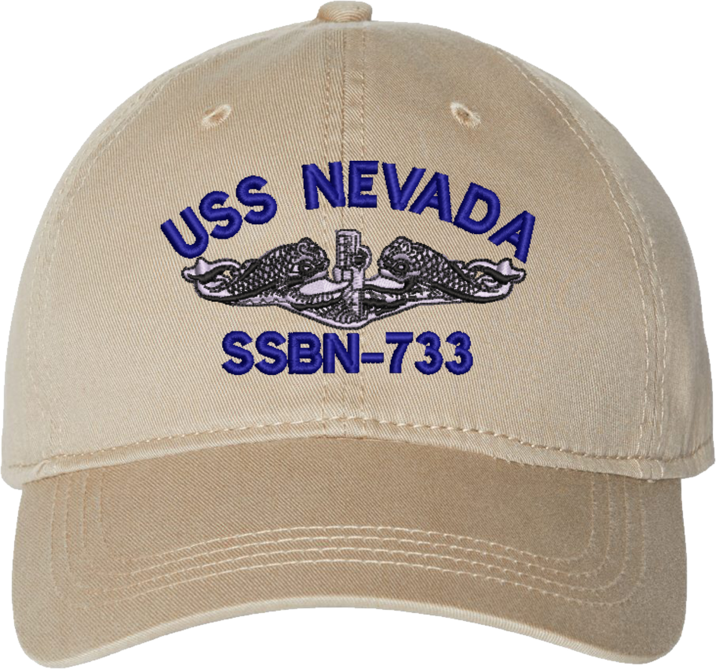 Show your Navy pride with this USS Nevada SSBN-733 with Dolphins Unstructured Dad Cap from MilitaryBest. Crafted from 100% washed chino twill cotton, this six-panel, low-profile cap offers a relaxed and comfortable fit. Featuring high-quality embroidery done in our Scottsboro, Alabama facility, this cap is designed with a pre-curved visor and an adjustable tri-glide buckle closure for a perfect fit. Whether for everyday wear or as a meaningful gift, this cap is a great way to honor your own or a loved one's service.For caps ordered with custom embroidered personalized text please allow an additional 3 to 5 days production time. All custom back text will be embroidered in ALL CAPITAL LETTERS. Caps with back text or eggs are non-returnable unless there is a material defect in the cap.