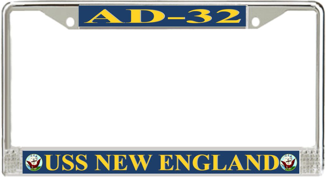 USS New England AD-32 License Plate FrameThis USS New England AD-32 License Plate Frame is proudly made in the USA at our facilities in Scottsboro, Alabama. Each of our MilitaryBest U.S. Navy Frames feature top and bottom Poly Coated Aluminum strips that are printed using sublimation which gives these quality automobile military frames a beautiful high gloss finish.