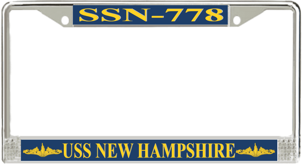 USS New Hampshire SSN-778 License Plate Frame This USS New Hampshire SSN-778 License Plate Frame is proudly made in the USA at our facilities in Scottsboro, Alabama. Each Frame features top and bottom sublimated design strips that are poly coated for a protective gloss finish. Please check your state and local regulations for compatibility of these frames for use on your vehicle.