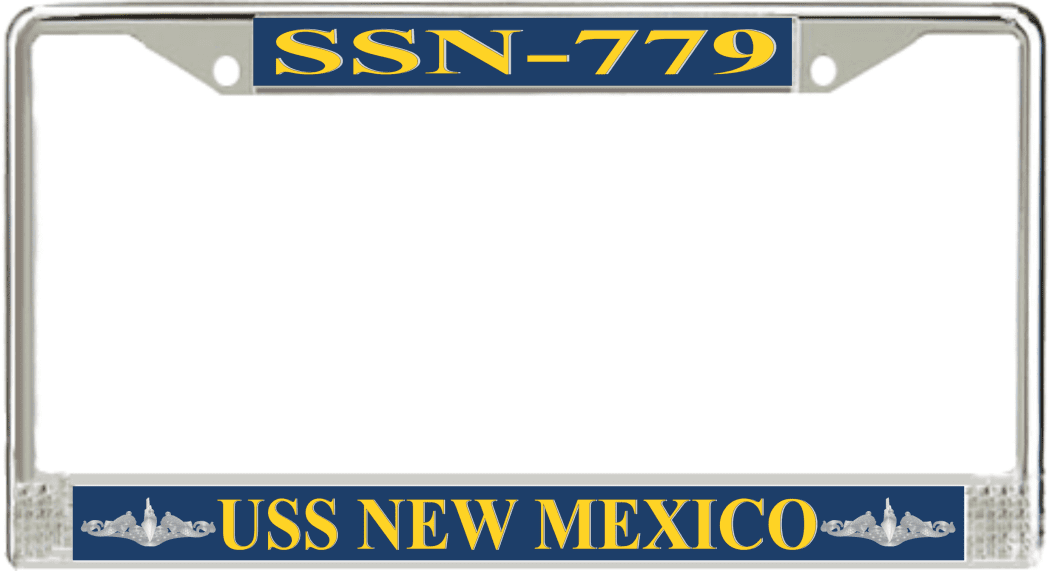 USS New Mexico SSN-779 License Plate Frame This USS New Mexico SSN-779 License Plate Frame is proudly made in the USA at our facilities in Scottsboro, Alabama. Each Frame features top and bottom sublimated design strips that are poly coated for a protective gloss finish. Please check your state and local regulations for compatibility of these frames for use on your vehicle.