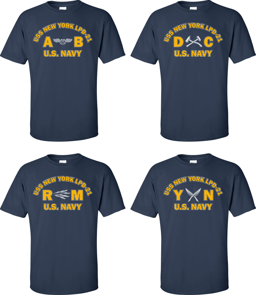 Due to disruptions in supply chains, this design will be embroidered on a Champion, Gildan, Jerzees or comparable brand.Proudly display your ship and rate with our top quality USS NEW YORK LPD-21 Rates t-shirts, sweatshirts, and hoodies. These fine U.S. Navy apparel items will make you the envy of your veteran buddies, or will make a fine gift! Our USS NEW YORK LPD-21 shirts are proudly printed in the USA!