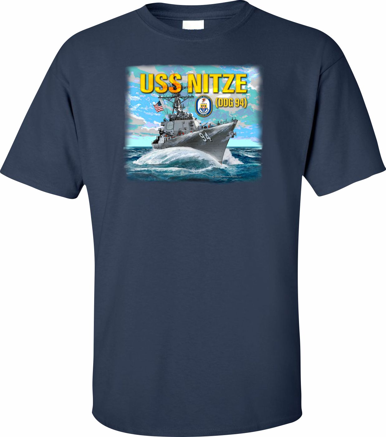 MilitaryBest is proud to offer this fine USS Nitze DDG-94 Printed Art T-Shirt. This shirt features a full front print, with beautiful artwork designed by licensed Navy artist David Hart. This shirt is available in black and navy blue colors. Each T-shirt is proudly printed in the USA.Unless there is a defect in workmanship or material, these shirts are unreturnable.