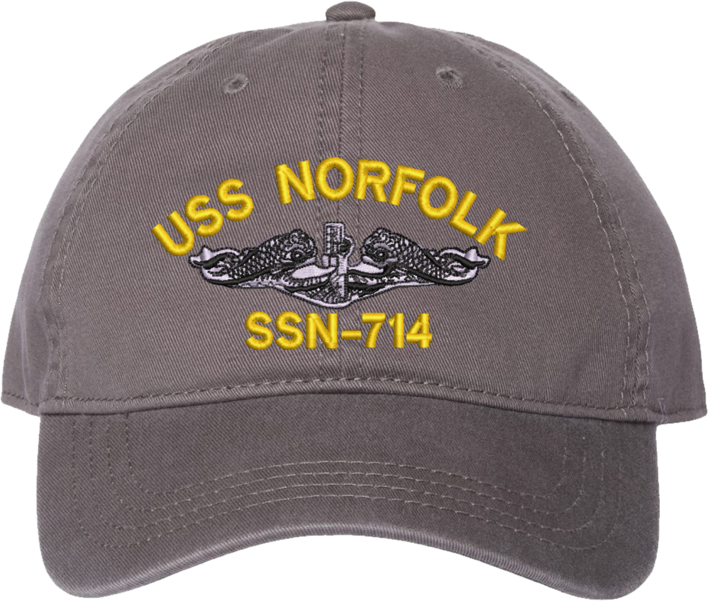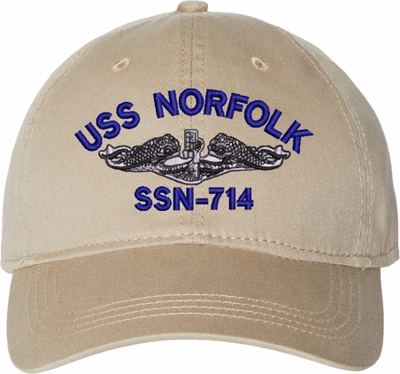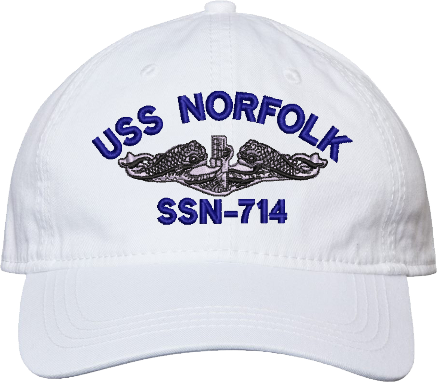 Show your Navy pride with this USS Norfolk SSN-714 with Dolphins Unstructured Dad Cap from MilitaryBest. Crafted from 100% washed chino twill cotton, this six-panel, low-profile cap offers a relaxed and comfortable fit. Featuring high-quality embroidery done in our Scottsboro, Alabama facility, this cap is designed with a pre-curved visor and an adjustable tri-glide buckle closure for a perfect fit. Whether for everyday wear or as a meaningful gift, this cap is a great way to honor your own or a loved one's service.For caps ordered with custom embroidered personalized text please allow an additional 3 to 5 days production time. All custom back text will be embroidered in ALL CAPITAL LETTERS. Caps with back text or eggs are non-returnable unless there is a material defect in the cap.