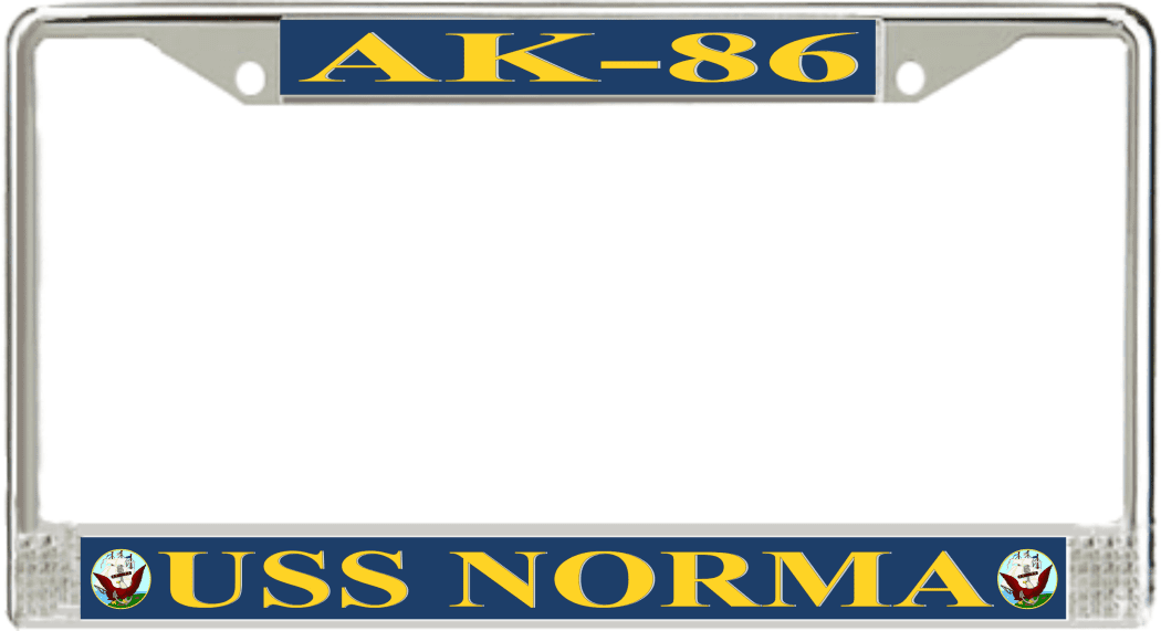 USS Norma AK-86 License Plate FrameThis USS Norma AK-86 License Plate Frame is proudly made in the USA at our facilities in Scottsboro, Alabama. Each of our MilitaryBest U.S. Navy Frames feature top and bottom Poly Coated Aluminum strips that are printed using sublimation which gives these quality automobile military frames a beautiful high gloss finish.