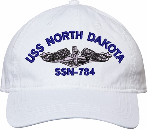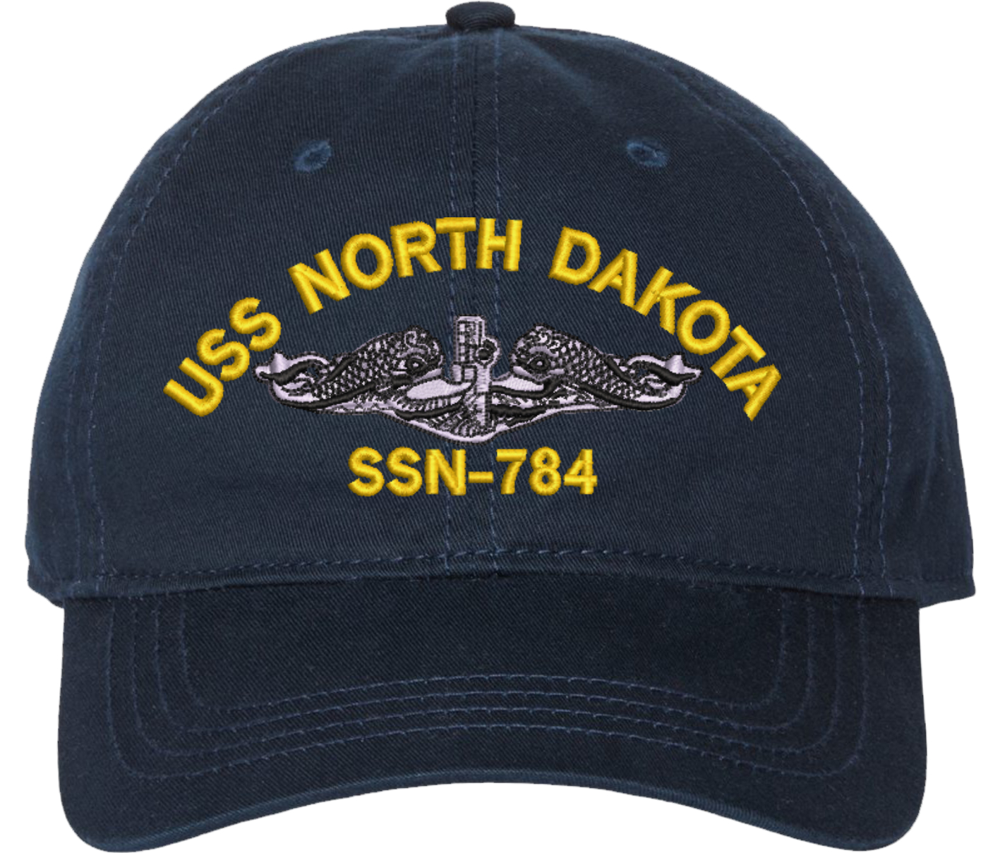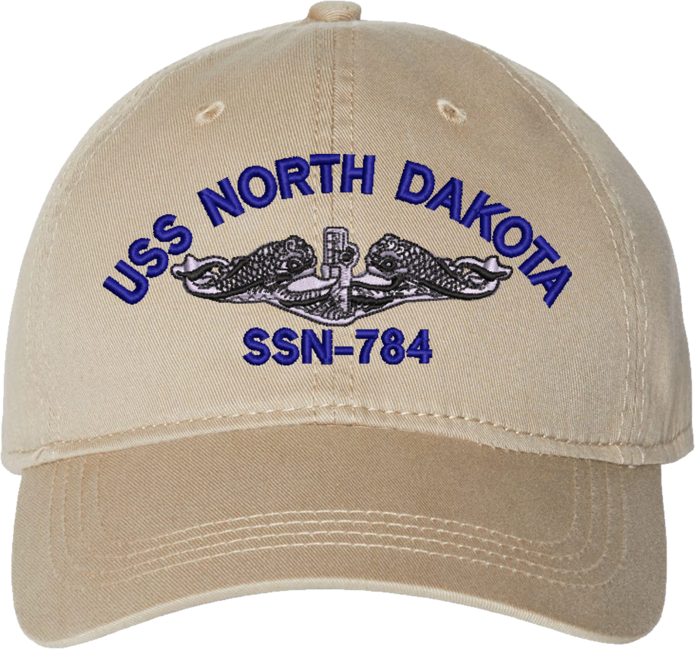 Show your Navy pride with this USS North Dakota SSN-784 with Dolphins Unstructured Dad Cap from MilitaryBest. Crafted from 100% washed chino twill cotton, this six-panel, low-profile cap offers a relaxed and comfortable fit. Featuring high-quality embroidery done in our Scottsboro, Alabama facility, this cap is designed with a pre-curved visor and an adjustable tri-glide buckle closure for a perfect fit. Whether for everyday wear or as a meaningful gift, this cap is a great way to honor your own or a loved one's service.For caps ordered with custom embroidered personalized text please allow an additional 3 to 5 days production time. All custom back text will be embroidered in ALL CAPITAL LETTERS. Caps with back text or eggs are non-returnable unless there is a material defect in the cap.