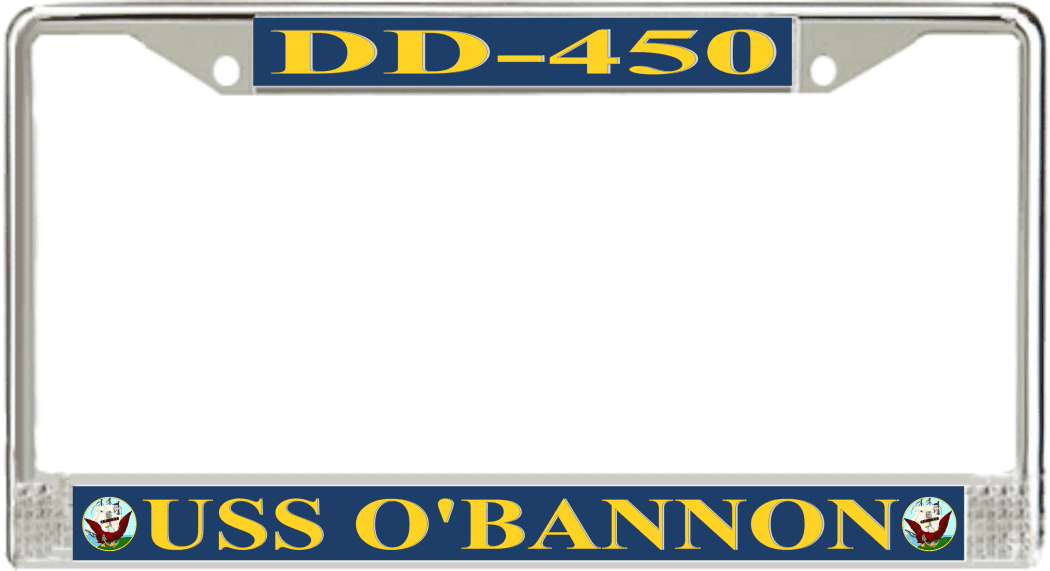 USS O'Bannon DD-450 License Plate FrameThis USS O'Bannon DD-450 License Plate Frame is proudly made in the USA at our facilities in Scottsboro, Alabama. Each of our MilitaryBest U.S. Navy Frames feature top and bottom Poly Coated Aluminum strips that are printed using sublimation which gives these quality automobile military frames a beautiful high gloss finish.