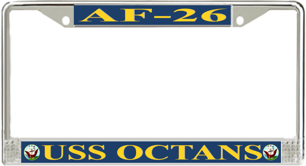 USS Octans AF-26 License Plate FrameThis USS Octans AF-26 License Plate Frame is proudly made in the USA at our facilities in Scottsboro, Alabama. Each of our MilitaryBest U.S. Navy Frames feature top and bottom Poly Coated Aluminum strips that are printed using sublimation which gives these quality automobile military frames a beautiful high gloss finish.