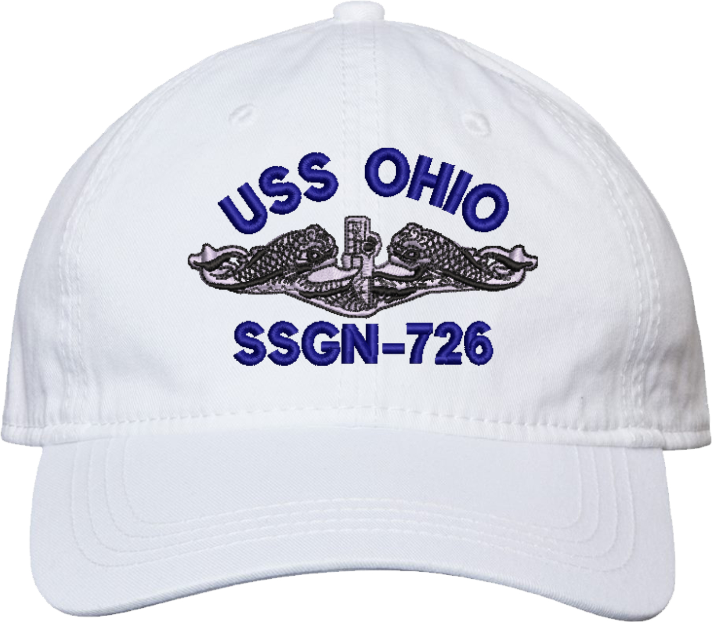 Show your Navy pride with this USS Ohio SSGN-726 with Dolphins Unstructured Dad Cap from MilitaryBest. Crafted from 100% washed chino twill cotton, this six-panel, low-profile cap offers a relaxed and comfortable fit. Featuring high-quality embroidery done in our Scottsboro, Alabama facility, this cap is designed with a pre-curved visor and an adjustable tri-glide buckle closure for a perfect fit. Whether for everyday wear or as a meaningful gift, this cap is a great way to honor your own or a loved one's service.For caps ordered with custom embroidered personalized text please allow an additional 3 to 5 days production time. All custom back text will be embroidered in ALL CAPITAL LETTERS. Caps with back text or eggs are non-returnable unless there is a material defect in the cap.