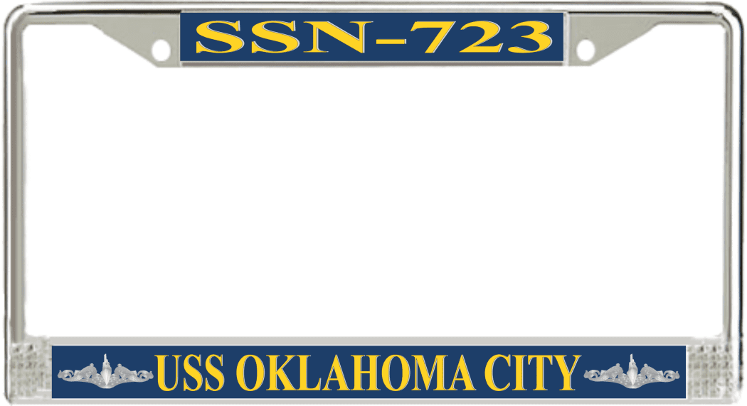USS Oklahoma City SSN-723 License Plate Frame This USS Oklahoma City SSN-723 License Plate Frame is proudly made in the USA at our facilities in Scottsboro, Alabama. Each Frame features top and bottom sublimated design strips that are poly coated for a protective gloss finish. Please check your state and local regulations for compatibility of these frames for use on your vehicle.
