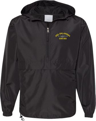 MilitaryBest is proud to offer this quality USS Oklahoma SSN-802 with Dolphins Hooded Windbreaker. Also known as an Anorak Jacket, this windbreaker is designed to keep wind and water out. With a design embroidered over the left chest, this windbreaker is embroidered to order at our facilities in Scottsboro, AL.. This windbreaker can be packed into the mesh lined pouch pocket for a more portable method of storage.- 100% Polyester