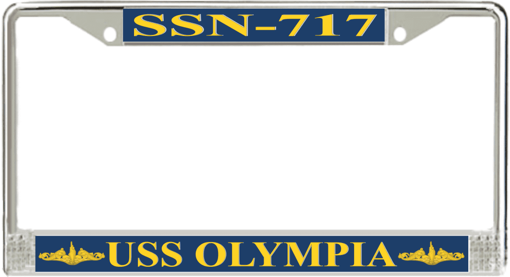 USS Olympia SSN-717 License Plate Frame This USS Olympia SSN-717 License Plate Frame is proudly made in the USA at our facilities in Scottsboro, Alabama. Each Frame features top and bottom sublimated design strips that are poly coated for a protective gloss finish. Please check your state and local regulations for compatibility of these frames for use on your vehicle.