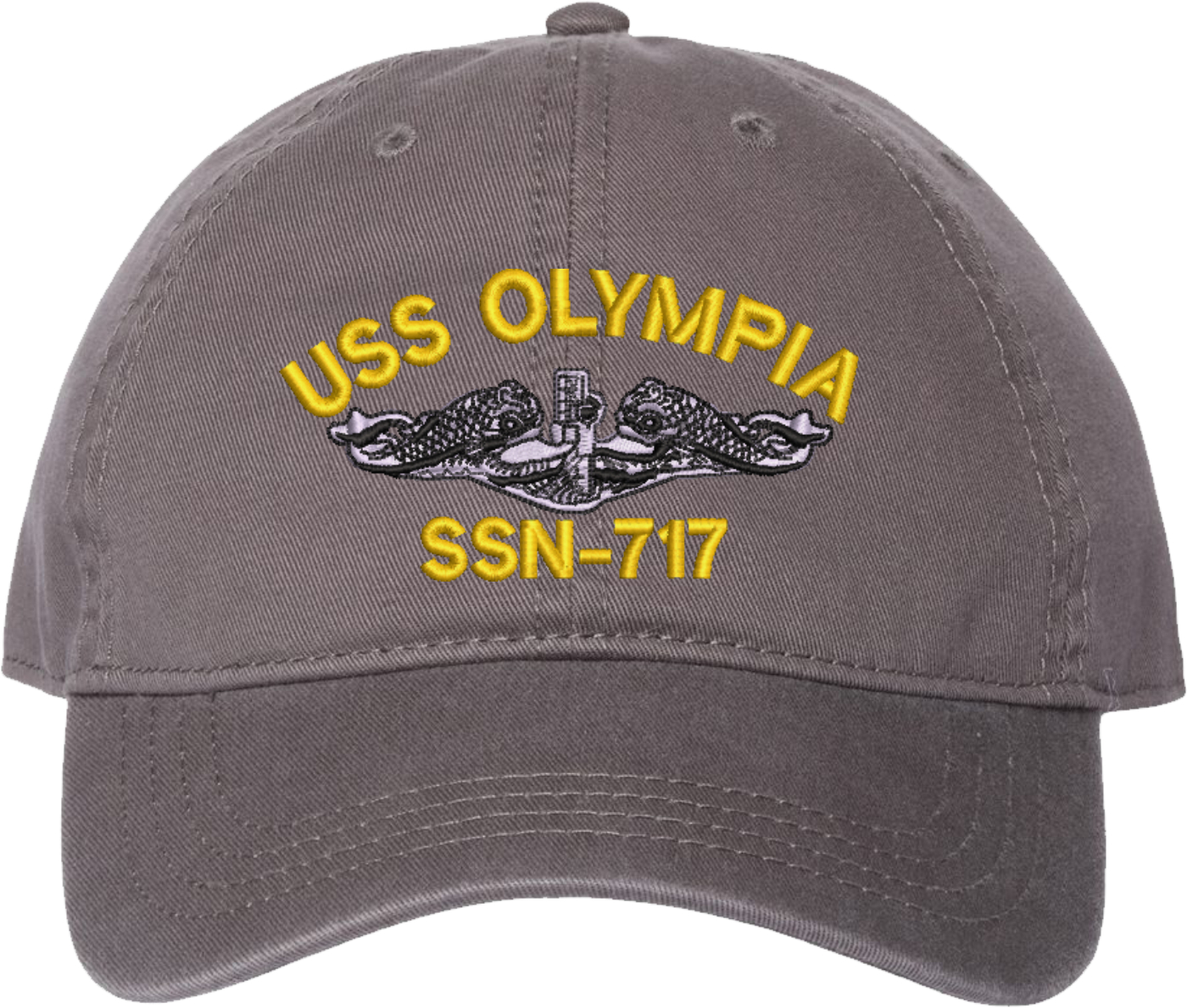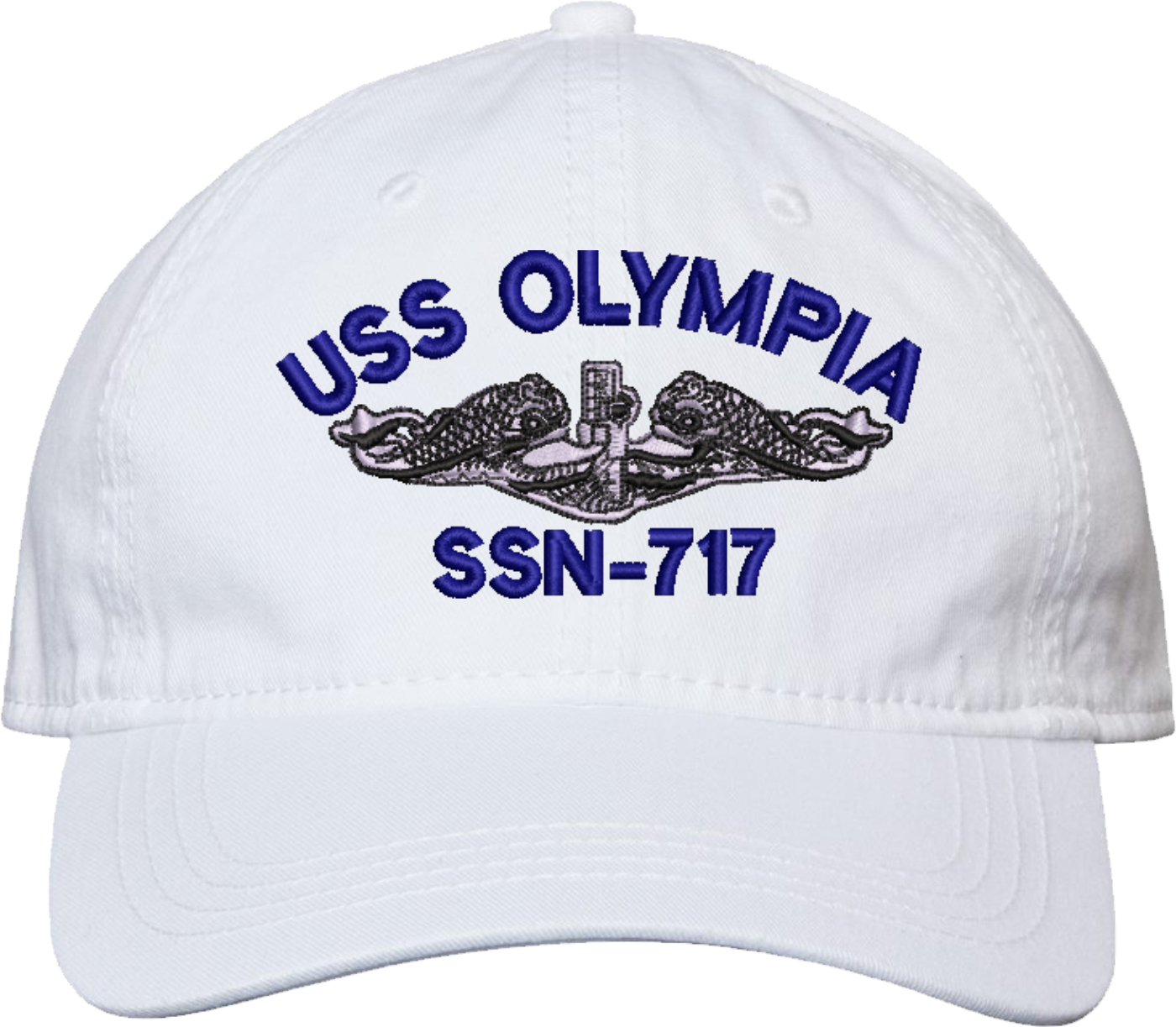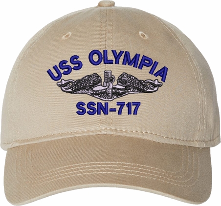 Show your Navy pride with this USS Olympia SSN-717 with Dolphins Unstructured Dad Cap from MilitaryBest. Crafted from 100% washed chino twill cotton, this six-panel, low-profile cap offers a relaxed and comfortable fit. Featuring high-quality embroidery done in our Scottsboro, Alabama facility, this cap is designed with a pre-curved visor and an adjustable tri-glide buckle closure for a perfect fit. Whether for everyday wear or as a meaningful gift, this cap is a great way to honor your own or a loved one's service.For caps ordered with custom embroidered personalized text please allow an additional 3 to 5 days production time. All custom back text will be embroidered in ALL CAPITAL LETTERS. Caps with back text or eggs are non-returnable unless there is a material defect in the cap.