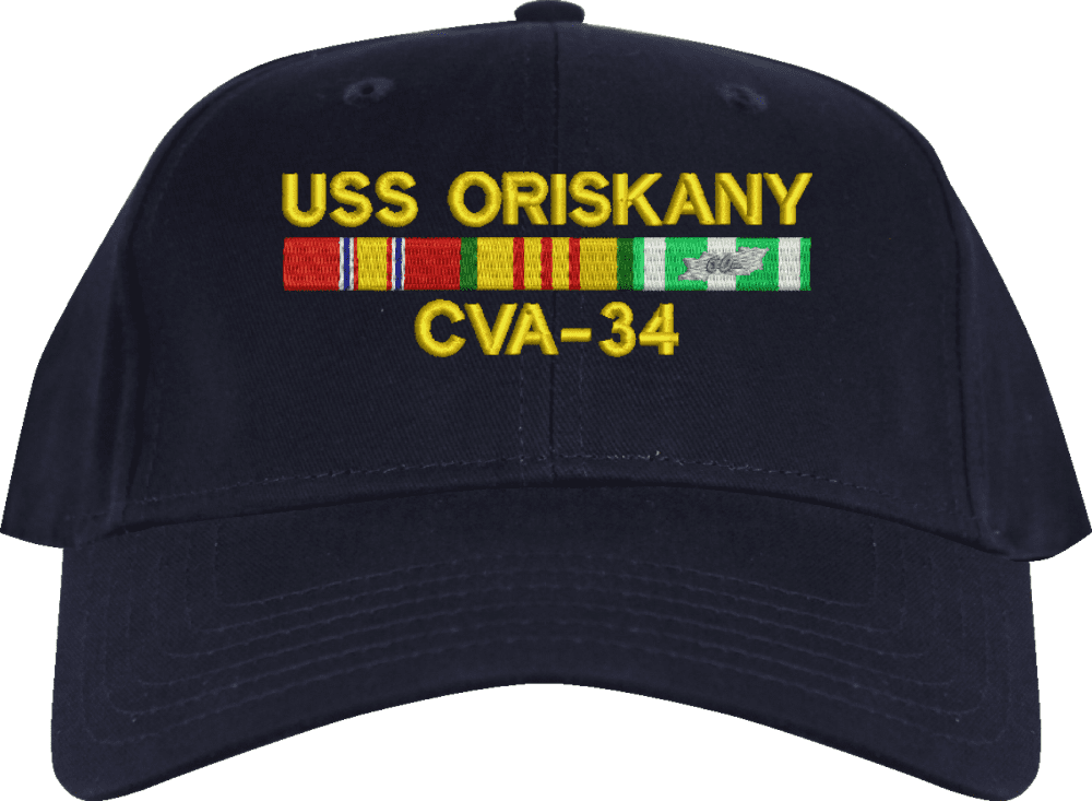 MilitaryBest is proud to offer this USS Oriskany CVA-34 with Vietnam Service Ribbons Embroidered Cap. This cap is available in a 5 panel high profile or 6 panel low profile styling. All our caps are made from top quality materials. This cap would make a wonderful addition to your collection or a great gift! All custom embroidery is done at our facility in Scottsboro, AL. *Caps ordered with embroidered back text requires an additional 1 to 2 days of production time. All personalized caps will be embroidered in ALL CAPITAL LETTERS. Caps personalized with back text are not returnable unless there is a material defect in the cap.A percentage of the sale of each MilitaryBest item is forwarded to the licensing departments of each respective branch of service in support of the MWR (Morale, Welfare, & Recreation) program. These payments are made by either ALL4U LLC or the wholesaler from where the item originated. Our team thanks you for your service and your support of these programs.