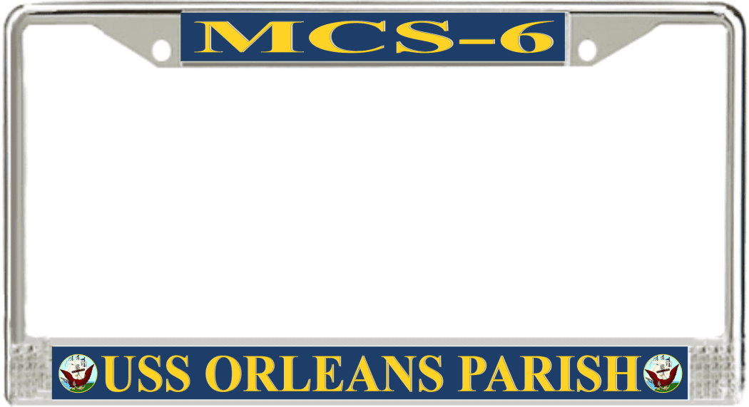 USS Orleans Parish MCS-6 License Plate FrameThis USS Orleans Parish MCS-6 License Plate Frame is proudly made in the USA at our facilities in Scottsboro, Alabama. Each of our MilitaryBest U.S. Navy Frames feature top and bottom Poly Coated Aluminum strips that are printed using sublimation which gives these quality automobile military frames a beautiful high gloss finish.
