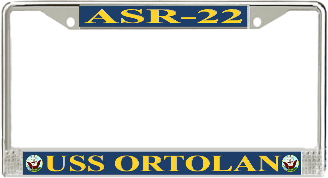 USS Ortolan ASR-22 License Plate FrameThis USS Ortolan ASR-22 License Plate Frame is proudly made in the USA at our facilities in Scottsboro, Alabama. Each of our MilitaryBest U.S. Navy Frames feature top and bottom Poly Coated Aluminum strips that are printed using sublimation which gives these quality automobile military frames a beautiful high gloss finish.