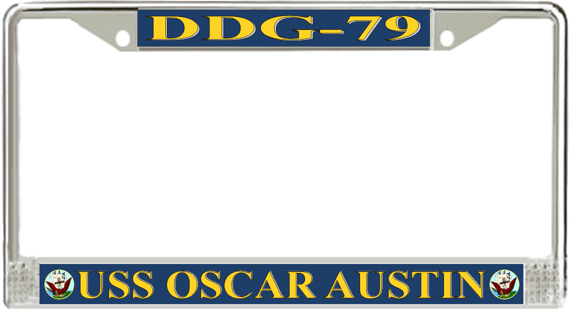 USS OscaráAustin DDG-79 License Plate FrameThis USS OscaráAustin DDG-79 License Plate Frame is proudly made in the USA at our facilities in Scottsboro, Alabama. Each of our MilitaryBest U.S. Navy Frames feature top and bottom Poly Coated Aluminum strips that are printed using sublimation which gives these quality automobile military frames a beautiful high gloss finish.