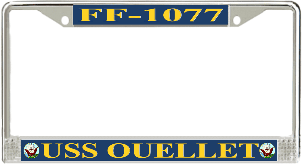 USS Ouellet FF-1077 License Plate FrameThis USS Ouellet FF-1077 License Plate Frame is proudly made in the USA at our facilities in Scottsboro, Alabama. Each of our MilitaryBest U.S. Navy Frames feature top and bottom Poly Coated Aluminum strips that are printed using sublimation which gives these quality automobile military frames a beautiful high gloss finish.