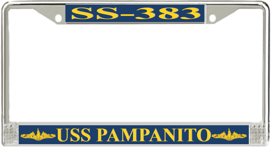 USS Pampanito SS-383 License Plate Frame This USS Pampanito SS-383 License Plate Frame is proudly made in the USA at our facilities in Scottsboro, Alabama. Each Frame features top and bottom sublimated design strips that are poly coated for a protective gloss finish. Please check your state and local regulations for compatibility of these frames for use on your vehicle.