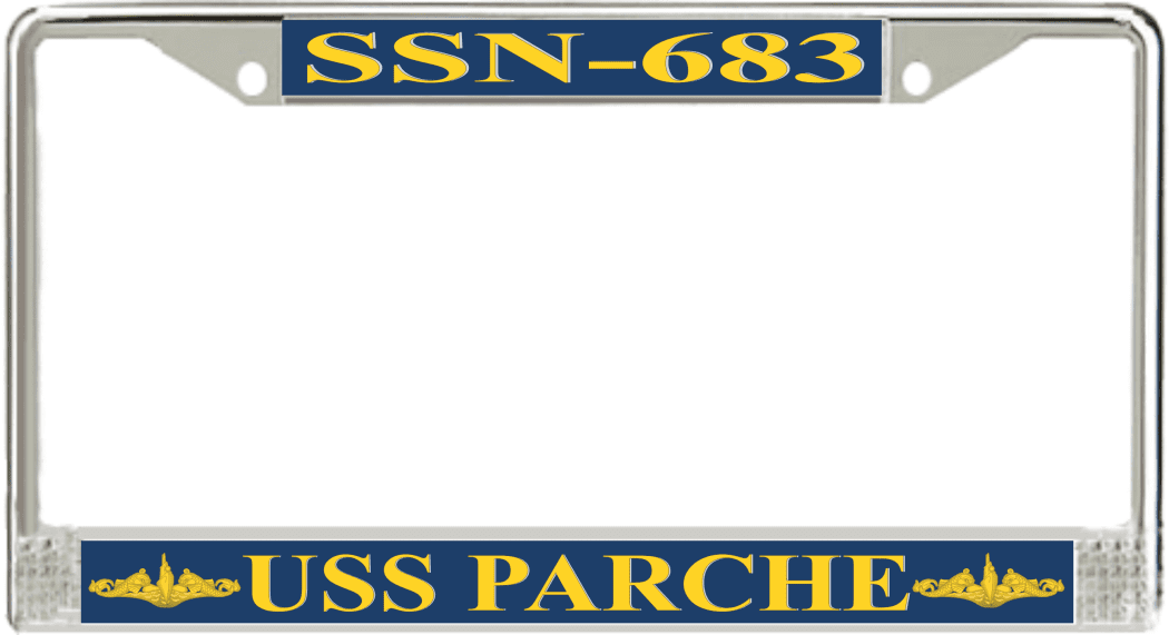 USS Parche SSN-683 License Plate Frame This USS Parche SSN-683 License Plate Frame is proudly made in the USA at our facilities in Scottsboro, Alabama. Each Frame features top and bottom sublimated design strips that are poly coated for a protective gloss finish. Please check your state and local regulations for compatibility of these frames for use on your vehicle.