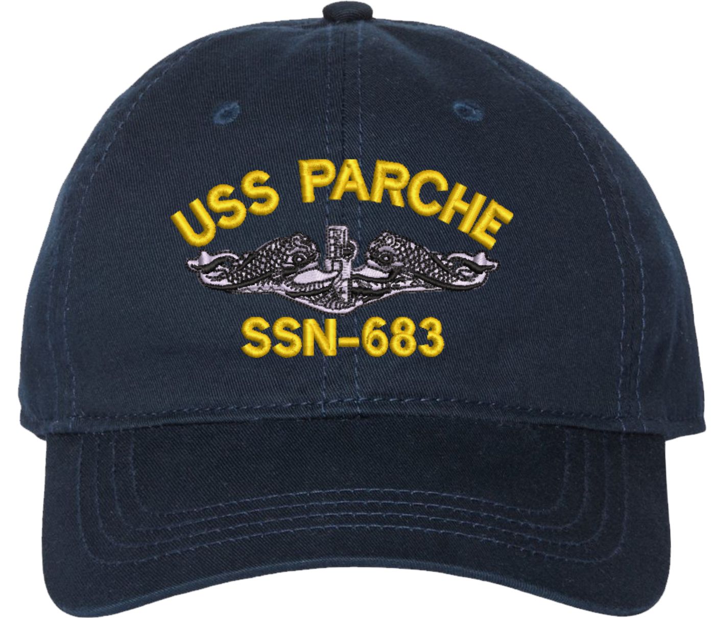 This USS Parche SSN-683 w/ Silver Dolphins Navy Blue Unstructured Dad Cap is an overstock item and is only available for the value price while supplies last. Clearance Items are not eligible for Refunds or Returns,A percentage of the sale of each MilitaryBest item is forwarded to the licensing departments of each respective branch of service in support of the MWR (Morale, Welfare, & Recreation) program. These payments are made by either ALL4U LLC or the wholesaler from where the item originated. Our team thanks you for your service and your support of these programs.