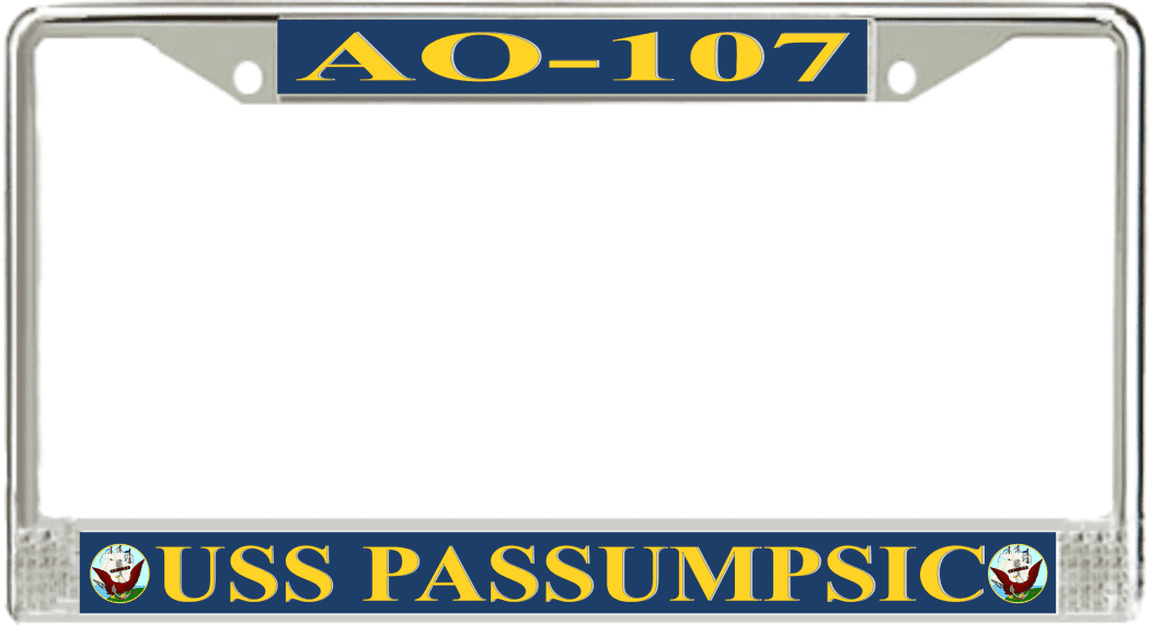 USS Passumpsic AO-107 License Plate FrameThis USS Passumpsic AO-107 License Plate Frame is proudly made in the USA at our facilities in Scottsboro, Alabama. Each of our MilitaryBest U.S. Navy Frames feature top and bottom Poly Coated Aluminum strips that are printed using sublimation which gives these quality automobile military frames a beautiful high gloss finish.