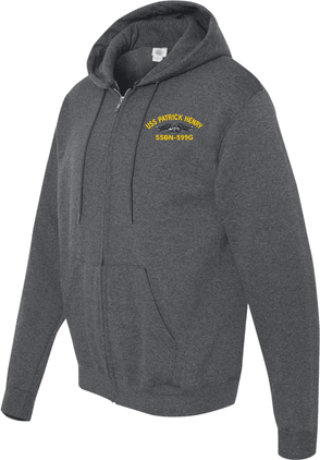 MilitaryBest has expanded its line of apparel with this custom embroidered USS Patrick Henry SSBN-599 with Dolphins Embroidered Zippered Hoodie. Each Hoodie is direct embroidered onto a Champion brand 9.5 oz 50/50 Cotton Poly blend. This will make an excellent addition to your wardrobe, or a great gift. Your satisfaction is Guaranteed! These quality zippered hoodies are proudly embroidered at our facilities in Scottsboro, AL. Support the Army MWR program by purchasing only from Licensed Vendors.