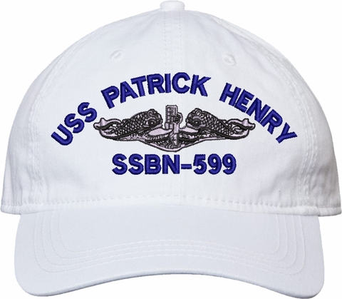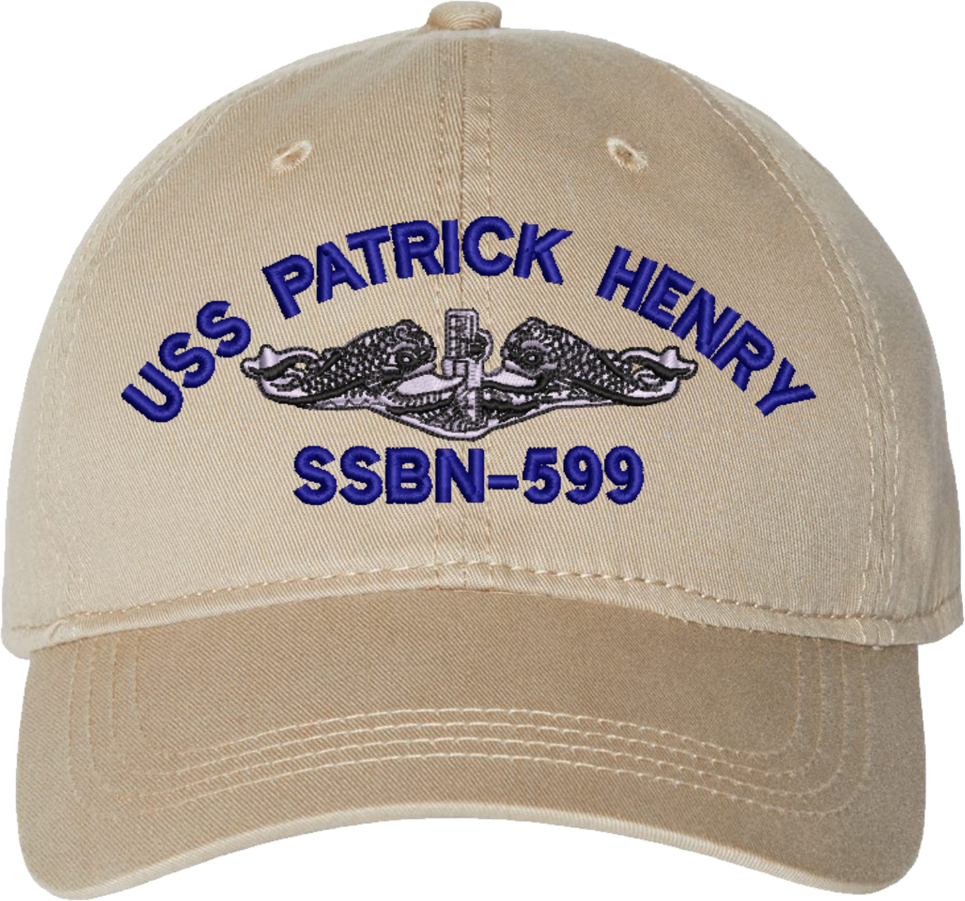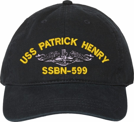 Show your Navy pride with this USS Patrick Henry SSBN-599 with Dolphins Unstructured Dad Cap from MilitaryBest. Crafted from 100% washed chino twill cotton, this six-panel, low-profile cap offers a relaxed and comfortable fit. Featuring high-quality embroidery done in our Scottsboro, Alabama facility, this cap is designed with a pre-curved visor and an adjustable tri-glide buckle closure for a perfect fit. Whether for everyday wear or as a meaningful gift, this cap is a great way to honor your own or a loved one's service.For caps ordered with custom embroidered personalized text please allow an additional 3 to 5 days production time. All custom back text will be embroidered in ALL CAPITAL LETTERS. Caps with back text or eggs are non-returnable unless there is a material defect in the cap.