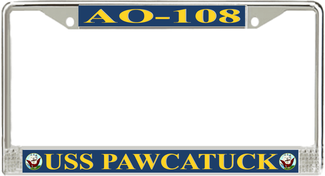 USS Pawcatuck AO-108 License Plate FrameThis USS Pawcatuck AO-108 License Plate Frame is proudly made in the USA at our facilities in Scottsboro, Alabama. Each of our MilitaryBest U.S. Navy Frames feature top and bottom Poly Coated Aluminum strips that are printed using sublimation which gives these quality automobile military frames a beautiful high gloss finish.