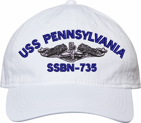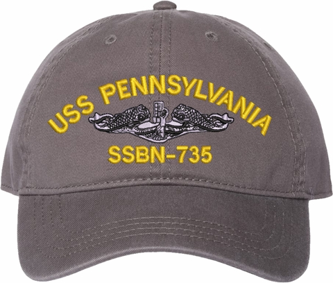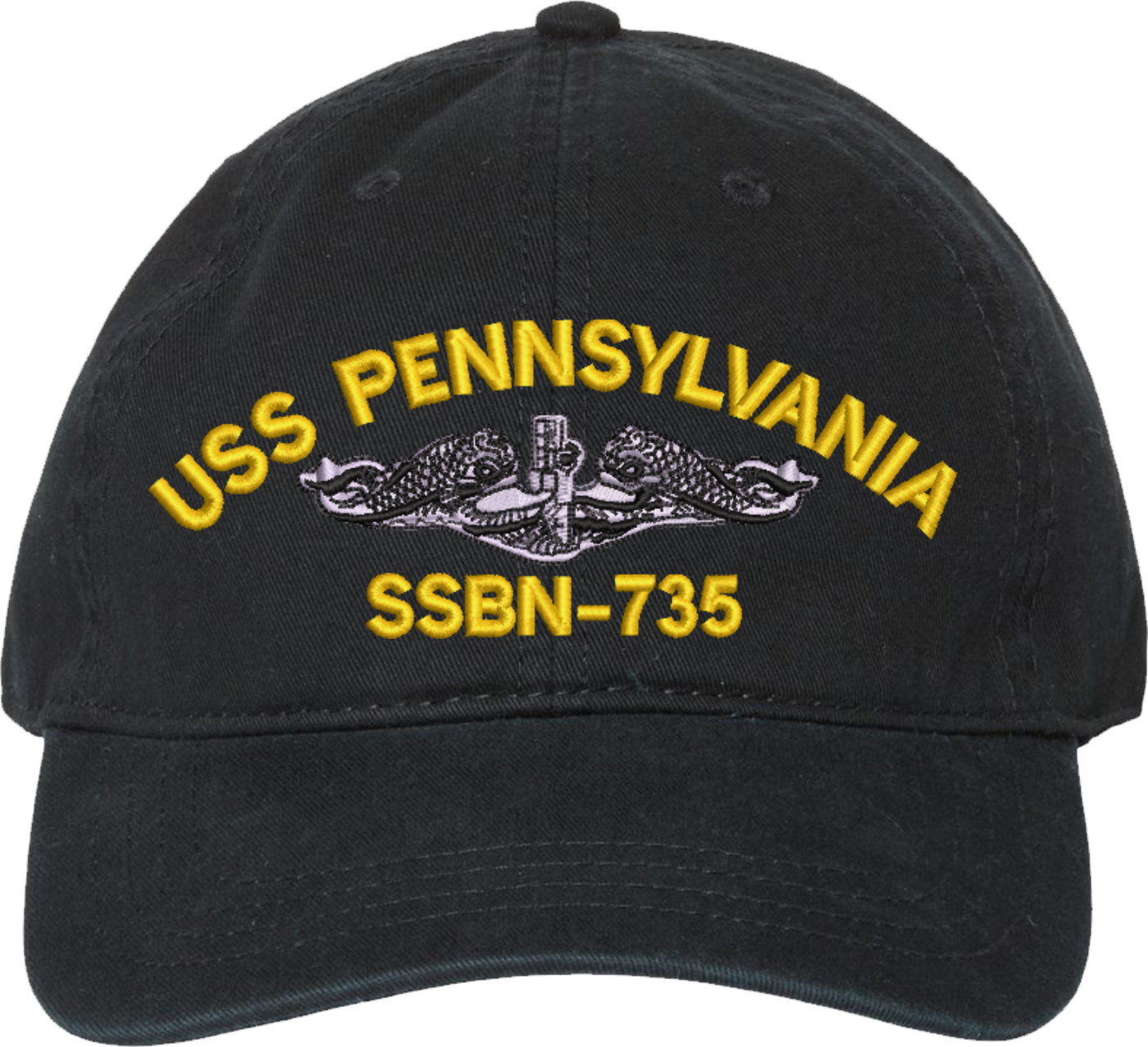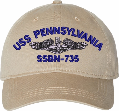 Show your Navy pride with this USS Pennsylvania SSBN-735 with Dolphins Unstructured Dad Cap from MilitaryBest. Crafted from 100% washed chino twill cotton, this six-panel, low-profile cap offers a relaxed and comfortable fit. Featuring high-quality embroidery done in our Scottsboro, Alabama facility, this cap is designed with a pre-curved visor and an adjustable tri-glide buckle closure for a perfect fit. Whether for everyday wear or as a meaningful gift, this cap is a great way to honor your own or a loved one's service.For caps ordered with custom embroidered personalized text please allow an additional 3 to 5 days production time. All custom back text will be embroidered in ALL CAPITAL LETTERS. Caps with back text or eggs are non-returnable unless there is a material defect in the cap.