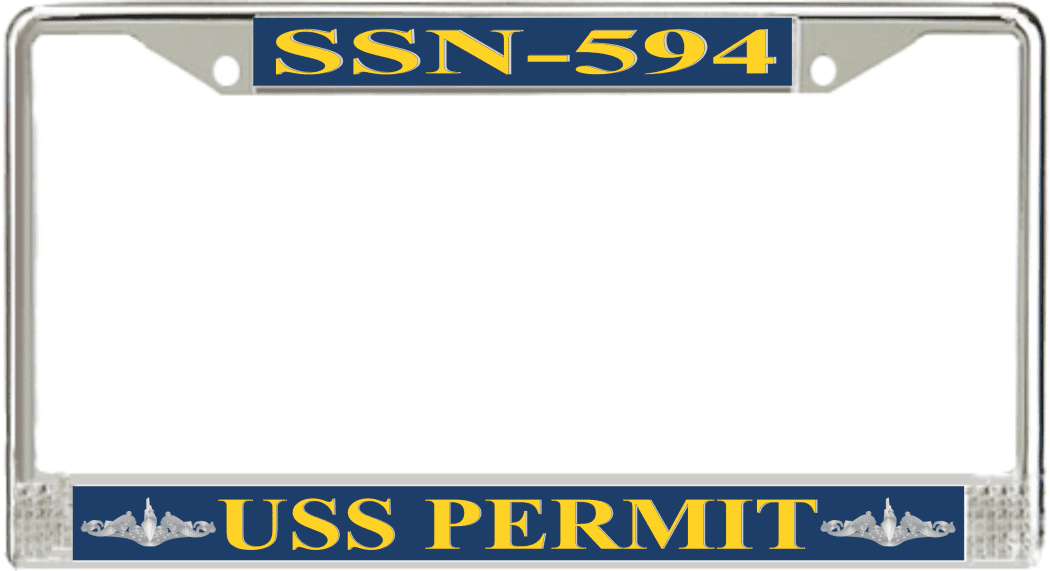USS Permit SSN-594 License Plate Frame This USS Permit SSN-594 License Plate Frame is proudly made in the USA at our facilities in Scottsboro, Alabama. Each Frame features top and bottom sublimated design strips that are poly coated for a protective gloss finish. Please check your state and local regulations for compatibility of these frames for use on your vehicle.